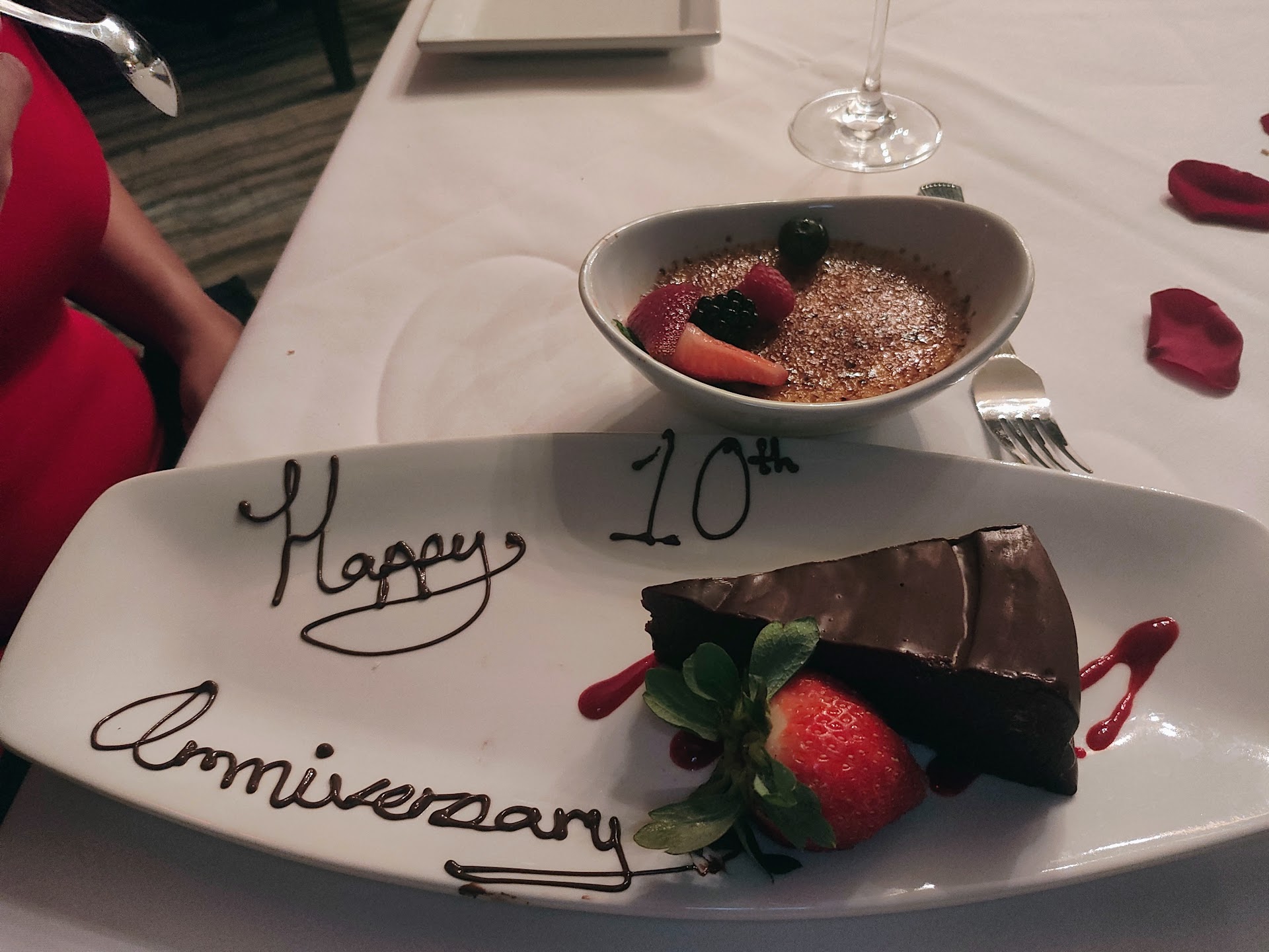 Read moreLike Khaki Pants or Ralph Lauren Polo Shirts, Ruth Chris Steak House is a true American original. Having been to Ruth Chris many years ago, my wife had never been. What better way to celebrate our 10 year anniversary than going to Ruth Chris. Upon arriving at our table, the staff had placed rose petals and all those we passed on our way wished us happy anniversary. We were seated and Armani arrived with water and fresh baked bread with butter. Not long after, Dylan introduced himself as our waiter and he too wished us a happy anniversary. We ordered the spinach, sun-dried tomato, artichoke heart with goat cheese appetizer. It was delicious. I had to fight the urge to place it on the floor to lick the dish clean. My wife ordered the pomegranate martini and I had the blueberry mojito. Both were very flavorful and enjoyable. We decided to split the roasted brussel sprouts side dish. My wife had the filet and I had the cowboy ribeye. When the side dish and steaks arrived with their signature 500 degree plates, we both were anxious to enjoy our meal. Dylan made multiple trips to ensure we were happy with each phase of our meal. Armani was present to pour more water and ensure our satisfaction. My wife commented how juicy, flavorful and tender her steak was. I nodded in agreement as I had my mouth full of ribeye and brussel sprouts. As we were enjoying our meal, Dylan asked if we were interested in dessert. I let my wife make the decision. She said why not. In a few minutes, Dylan was back. We couldn't make up our minds so decided to have the creme brulee and the flourless chocolate cake. Dylan commented on our choices as they both were favorites of the staff and other diners. Shortly, Dylan returned with both desserts saying they were on the house as their way of celebrating our wedding anniversary. The chocolate cake had "Happy 10th Anniversary" written in chocolate on the plate. Upon seeing this, both my wife and I were overwhelmed by the gesture and extra touch. Both desserts exceeded our expectations. Ruth Chris is one of the premier restaurants for a reason. They aren't the cheapest. Yet if you're looking for quality, and an extraordinary meal with the phenomenal amenities that make you feel valued as a customer, you won't find a better choice than the Saint...