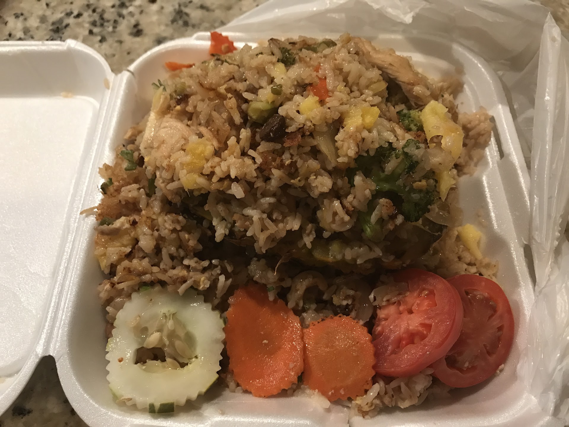 We were shocked to disciver an unpalatable mound of wet gelatinous rice saturated with fish sauce, soggy vegetables including broccoli and no chicken. It looked as if leftovers from diners were scraped onto a pineapple shell and absolutely nothing like the picture given for the dish on the website. Please do your own comparison.