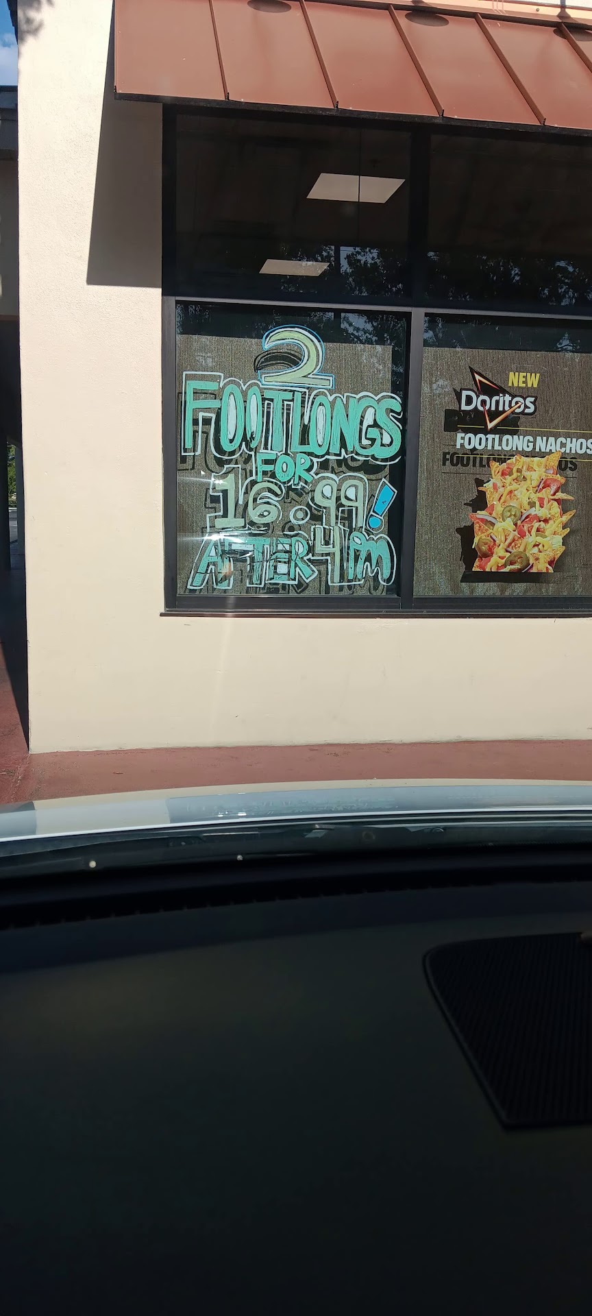 Painted on the windows is a sign that says 2 subs for 16.99 after 4pm. As it was 5:30 my son asked to get subs so I pulled over. When it was time to pay the subway employee rung up my order I pointed to the sign and he refused to change the price stated I need a coupon. I said there is no mention of a coupon just a time frame which I was ordering in. He refused to change the price. After this experience I will not be coming back to this location the worker...