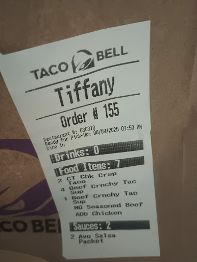 Read moreThis is hands-down the worst Taco Bell I think I’ve ever been to. Came in to pick up my order waited 7 minutes for the girl working drive through ,which is probably 5 feet away from counter to come up to the front counter. I asked her about the order I was picking up. She said it’s not ready yet. I stepped outside for about 5 minutes. I came back in and waited at the counter for about another 5 minutes, when the same girl finally came back up to the counter which was again 5 feet away, and asked if she could help me. Apparently she didn’t remember who I was or why I was there. I asked her if the order is ready that I was waiting for. I asked how much longer it would be? She said let me check on it and she turned around and just went back to the drive through window with out even checking, lol. About another 5 minutes passed when a manager came up to change out a cash drawer, I asked her how much longer on my order she said she would check. She walked back and came back with my order in less than 20 seconds. Lol I can’t believe this so it must’ve been ready for at least a few minutes . The customer service at this place is straight trash. The food was cold. It was a terrible experience. I would highly recommend that you go to a different Taco Bell. If I could leave zero stars, that would still be too good for this place. This place is straight trash. But this is my opinion nothing more...