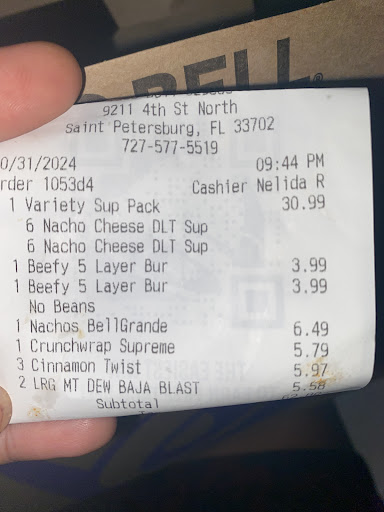 Read moreThis taco bell is honestly contributing to the reason why people hate on fast food so much. I just got out of work and I wanted to grab some food and I ordered two beef quesoritos and I understood going through the drive thru that it would be a little wait because they were very busy. I waited for about 25-30 minutes and finally got my food and I go to drive off and the lady at the window stops me and rechecks the bag because she knew it was messed up. She fixes it and I drive home. I get home and see my quesaritos are ridiculously thin and skimpy. I bite into it and its legit beef and red peppers. Theres not supposed to be peppers in a quesarito and there was NO CHEESE WHATSOEVER. Queso literally means cheese. I’m beyond livid about this because then when I tried to call the store to talk to someone about this issue, no one picked up. I called at least 10 times and no one answered the phone. This taco bell was a TERRIBLE experience and I DO NOT RECOMMEND AT ALL TO GO HERE. Take the extra drive and go to a different one because it’s not worth the headache trying to get your...
