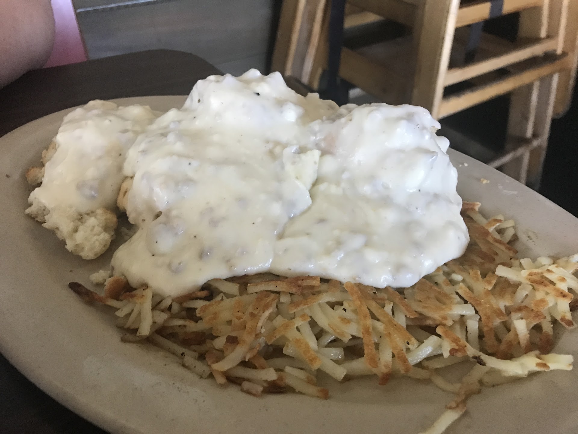 Read moreI don't even know where to start... They allow no substitutions on the menu. So I ordered a 1/2 cup of Cuban beans with my omelet. I ordered the meat eaters. It was less than tasty and small. My wife ordered the biscuit and gravy... The biscuits were overcooked. The gravy was like paste with zero taste. And the hash browns looked like waffle house recovered hash browns six days old. I love waffle house. Our waitress sucked. She was busy stuffing her face with food, not checking in on us. My wife commented that the biscuits and gravy were probably the worst she ever had. The waitress replies they are Greek biscuits and gravy. Who knew? Her statement turned out to be a lie—also, no water refills. Btw google can't find a recipe for Greek biscuits and gravy. Picture #6 shows our waitress eating. Like I want your hand to mouth saliva touching the plates I'm eating off of. Also you never washed your hands after what you ate... Gag.. Nasty... Horridness.