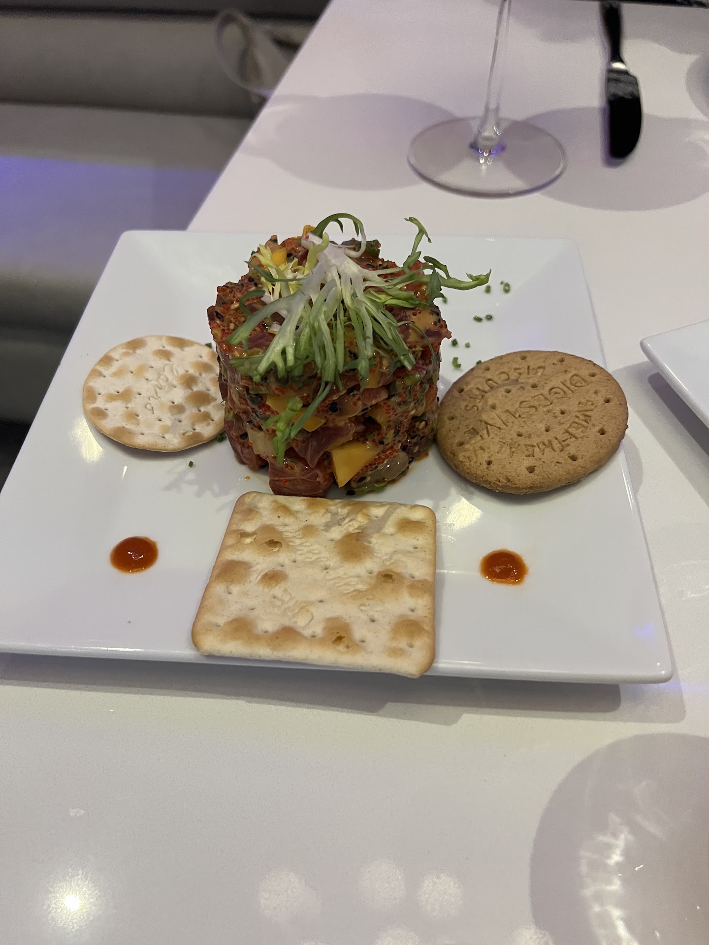 When we arrived, we were seated immediately and started with $6 High Noons and a bottle of fancy sparkling water ($12). • Stuffed Chicken Wing ($19): At first I was a little taken aback—one wing for that price?! But it’s stuffed with 3–4 ounces of crab meat (the bone is removed). It turned out to be the most perfectly crisp, flavorful chicken wing I’ve ever had. Absolutely worth it. • Seafood Dumplings ($15–16): Perfectly cooked, with a delicious sauce. On their own, they could’ve used a touch more seasoning for that flavor punch. • Wagyu Flight ($99): No regrets here—just perfection. Pro tip: if you’re struggling with the coarse salt shaker, pop out the rubber gasket and salt bae yourself a pile. • Bread Side ($8): Served with an insanely good pesto. Crisp but not cracker-like, it really balanced the meal. • Truffle Fries ($8): Perfectly crispy, every single one. Only complaint—needed more salt.