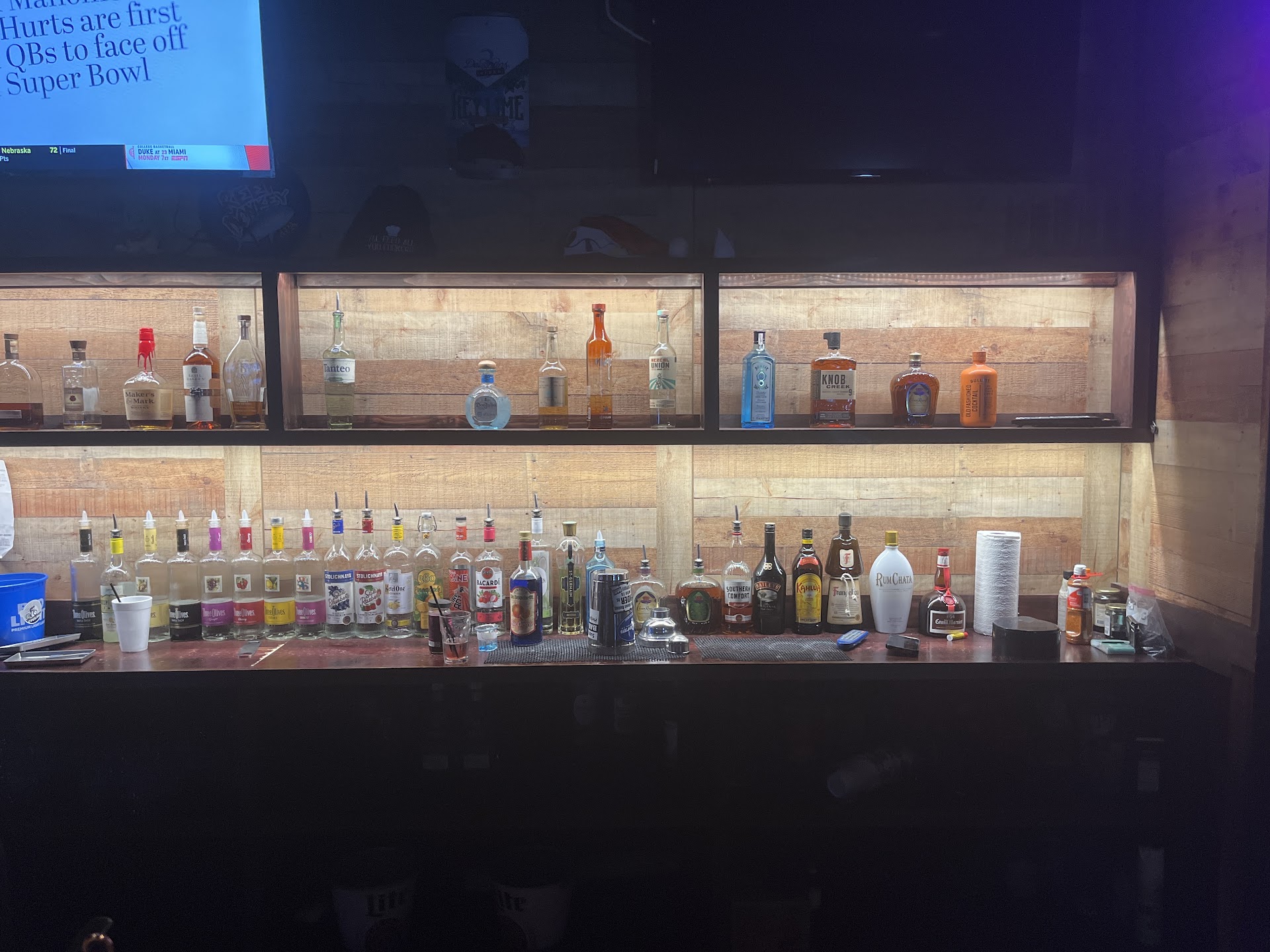 They offered 50% off drinks up to $25 (which was later changed to $20) from 12pm to 9pm, so we showed up at 7:30pm to catch the NFL game and get some cheap drinks. It took over 20 minutes at the bar for someone to see us, and every time after it took almost as long. They didn't have the game on, and asked us to put it up for them, we did, and continued drinking. We had 4 beers and a shot a piece (8 beers and 2 shots total). Bill still came out to $55+. We asked about it and they said that they applied the discount, which doesn't make sense mathematically. [8x3 (for domestic draft)+ 10x2 (for standard shots) = $44+tax]