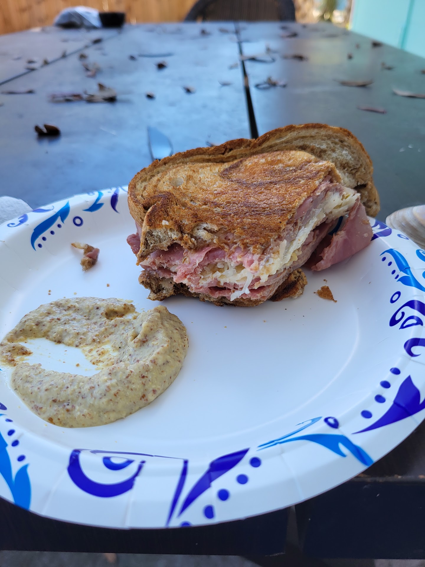 Went to the Courtyard to listen to the music and it was so nice out that night we decided to stay and eat. We ordered apps first , hummus and the pickle fires which were excellent. Then went for the sandwiches, we usually get the Cuban which is always excellent but also decided to try the BBQ pork. It was a pleasant surprise as it was very tasty, but I thought I was getting bbg sauce on it and if there was it was very little. I noticed afterward that on the menu it mentioned Cole slaw but there wasn’t any of that. So I am not really sure what I got, except it was still good. It started to rain but we were under the canopy and moved in a little and just became friends with the people next to us. The DJ was good and we had a very...