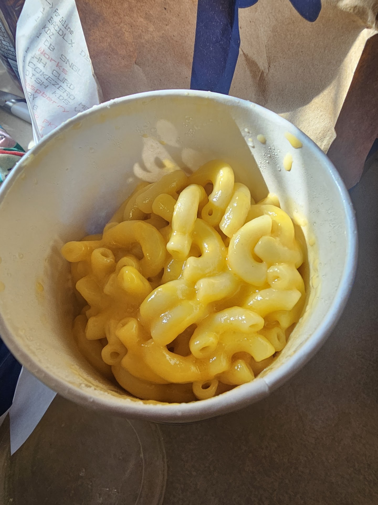 But then I got home and my mac and cheese was less than half full and dry and my husbands chili cheese fries were on the bottom in a cardboard container and it broke apart and was all over the place. We only live about 5 minutes away so it wasn't sitting around for a long time.