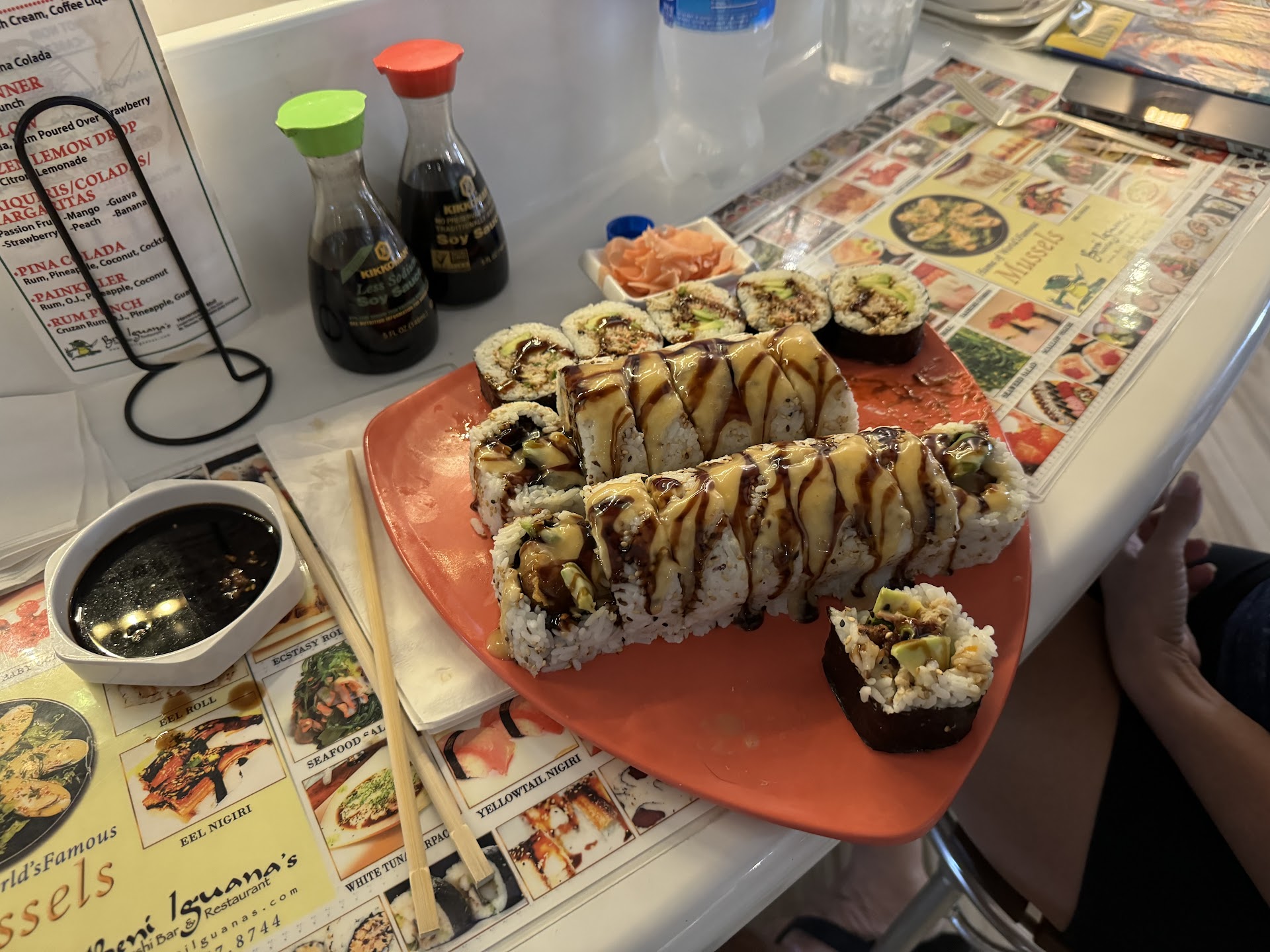The size of the sushi, is impressive. Forget the chopsticks, you'll need tongs to eat them with. It's like they are trying to overwhelm you with rice, to justify the value you are getting with their insane prices for rolls ($16.50-$19.50 for rolls?!) You're not going to get the presentation you're used to stateside. Not only are the rolls large, but they are not well rolled so they fall apart easily. It's like you should just mash everything up on your plate, pour some iguana sauce on it and eat it with a fork. Freshness is also not the best. I hate it when my fish is fishy, you know that "its been sitting out too long" taste, its just nasty. We've tried the Big Bill Roll (ahi, hamachi and avocado), Dynamite Roll ( Spicy crab and scallops with tobiko) , and Rainbow Roll (ahi, salmon and crab with avocado), and I wouldn't honestly order any of them again.