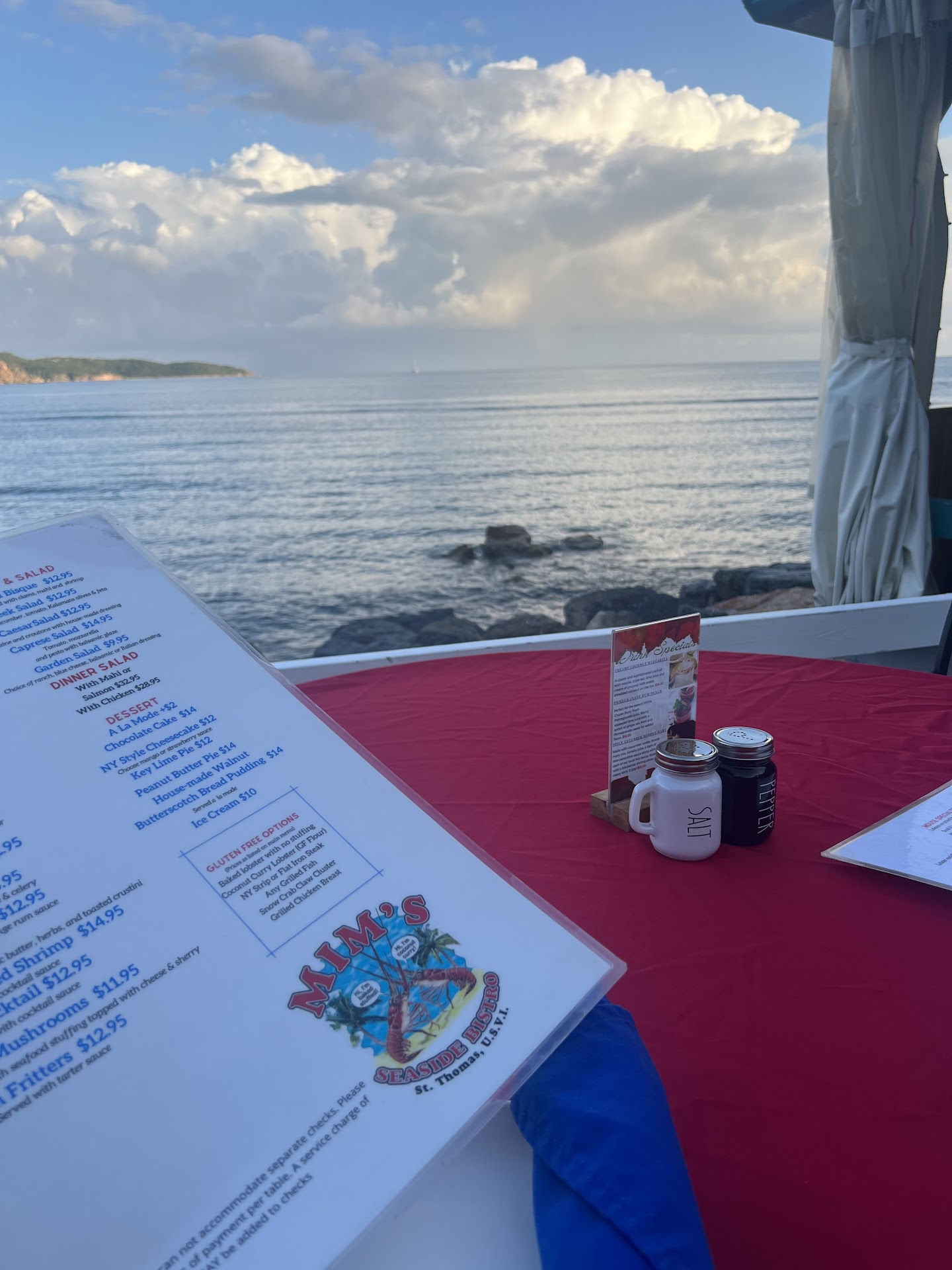 Read moreSo my wife and I were spending a few days in St Thomas and decided to go to Mim's Bistro on our last night. First of all, the parking is terrible. The parking lot is very tiny, and every space is marked for residents only, so you just have to figure it out. We had reservations for 730 but got there early and there was no wait, so we got right in. The ambiance is perfect. We were right on the edge of the ocean. So that gets a 5 star. Now the service. Our waitress was pleasant, but you have to remember you're on island time because she wasn't speedy. It took a while for our appetizer to come out. I was honestly expecting it to come out with our meal be cause it was taking so long. It finally came out, crab dip, and it was just OK. I honestly think it was fish dip because it had no crab flavor, and the consistency was more of fish than lump blue crab. I was only fooling myself about the entrees coming out with the apps because it took forever for the main dishes to come out after that. So the speed of service was 2.5. I ordered a large lobster coconut curry, so I knew it was going to be expensive. My wife ordered the snapper picatta. You can see the pics of both of our meals. Now mine was large. And it did have some large chunks of lobster. I can guarantee you, though, they did NOT use this entire lobster in MY dish. The amount of lobster in my dish was not equivalent to the size of the lobster tail shell they served it in. They served my meal with the wrong two sides, but it had taken so long to get, I decided to just let it be. The flavor is pretty good. Mildly sweet without the curry being overpowering. The presentation looks like a big ole mess, though. The amount of lobster was not worth the $148 they charged me for it, so value of meal gets a 2 stars. After tallying everything, they actually get a 2.56 stars but Google doesn't let you do that so 3 stars. There might be other things that would be better, but I doubt I would come back just for the ambiance of...