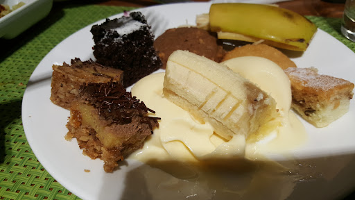 Breakfast - an assortment of muffins, pastries, eggs, freshly made waffles and pancakes, salad, a few rice and pasta dishes, baked potatoes, bacon, coffee, juice, etc.