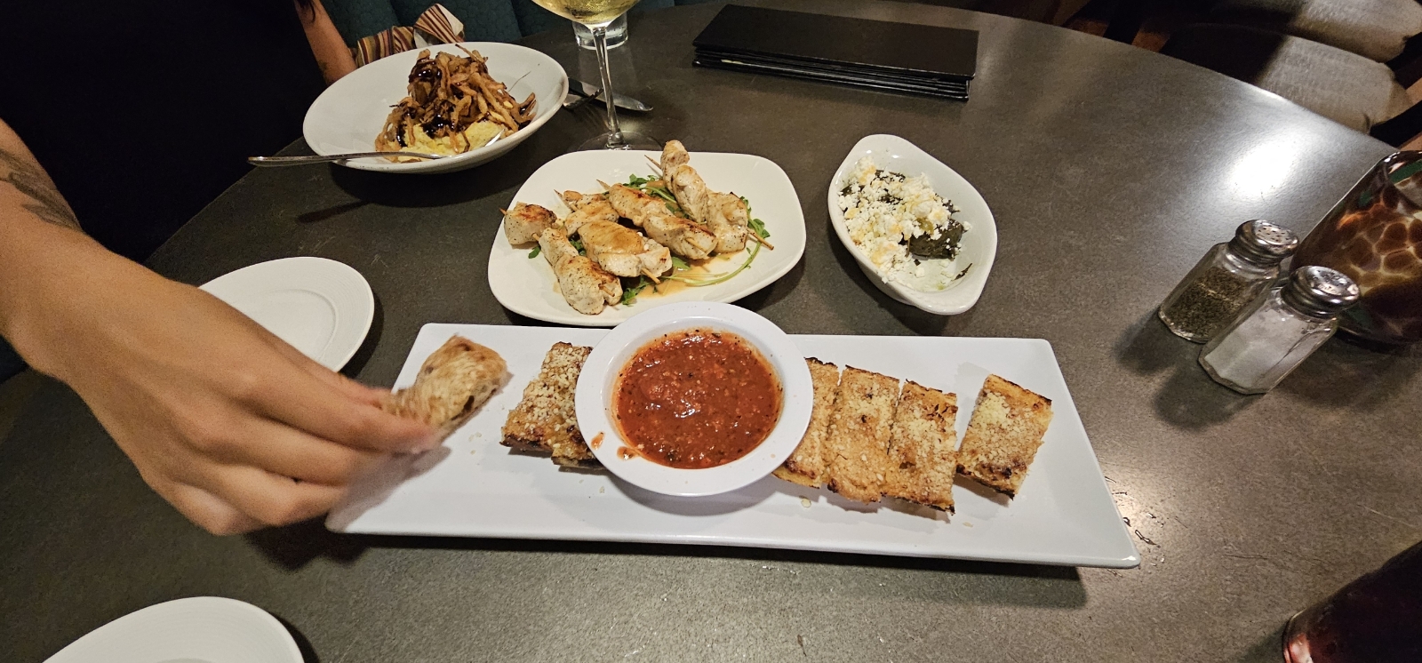 The garlic bread was actually one of the better parts of the meal, though it had an unexpected spicy kick I wasn’t ready for. Maybe that’s on me, but it still felt odd. We also tried the dolmas with honey and feta. There was an overwhelming amount of feta piled on top and not much flavor overall. I usually enjoy dolmas, and these just didn’t land.