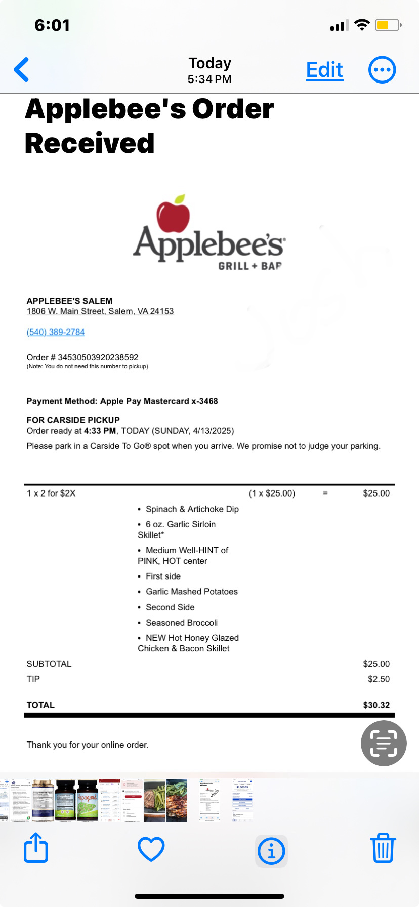 Read moreUpdate: the folks at Applebee’s in Salem reached out and asked to fix the issue. Seems they had some new staff that were learning the ropes and my slaw was put into the wrong sized container. They provided me with another order of the tacos either as a takeout order or at the restaurant. We were in Salem for an appointment, so we opted to stop and eat on our way home. They made me a beautiful order of tacos, but in their exuberance in getting them perfect they put too much of the sauce on and the tacos were swimming. They were extra spicy, but I was able to eat most of them after using a napkin to absorb some if the sauce. Since then I've picked up a few "to go" orders, asked for extra slaw and they have been perfection. I picked up 2 of the Chicken Wonton Taco appetizers as a "to go" order on my way home. The order was ready on time and the lady who brought it curb-side was very nice. However, when I arrived home, I found that I had one tiny "to go" cup, only half full, in each of my tacos orders. That is about enough slaw for 1 of the 4 tacos and honestly its the slaw makes these tacos good. Extremely disappointing that I spent $22 on appetizers (and it wasn't during the half price appetizers timeframe) and the order wasn't complete like it should have been. You can see in the photos that the "to go" cup is the smallest they have and it's...