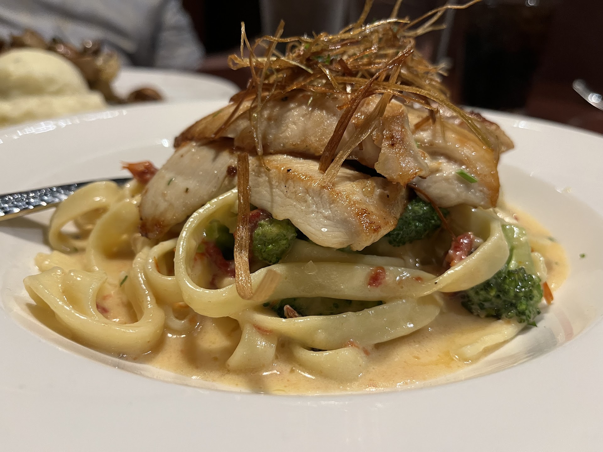 The food, wow. The food was amazing. My partner ordered the fettuccine, he loved it. He's not usually a big fan of veggies but he found the broccolini very flavorful, even wanted more! And he's a bit picky about food, he struggles with meats that have fat on them, but he loved the chicken as well. Only thing he didn't love were the shredded green/spring onions on top. I had the braised shortrib, sauce on the side. It was beautifully cooked served on a bed of mushroom risotto and charred broccolini. Naturally I was concerned that the sauce would be just a little overwhelmingly spicy however it was not at all problematic. The meat was so well cooked it simply fell apart when I touched it, and the risotto was not overcooked or mushy at all, nor was it undercooked and crunchy. The only trouble I had was that the bread they served before the meal was very hard on the outside edges, I have jaw damage and could not eat it. A slight drawback was that my risotto had a few short black hairs in it, but I'm not the type to get grossed out by just hair. A gentleman who I assumed was a manager or shift leader did come over and asked if I still wanted it and I assume if I had said no they would have offered to remake my dish or somehow make amends for it, but I wasn't all that offended by it and said it was fine so he said he would pass the message on to the cooking staff.