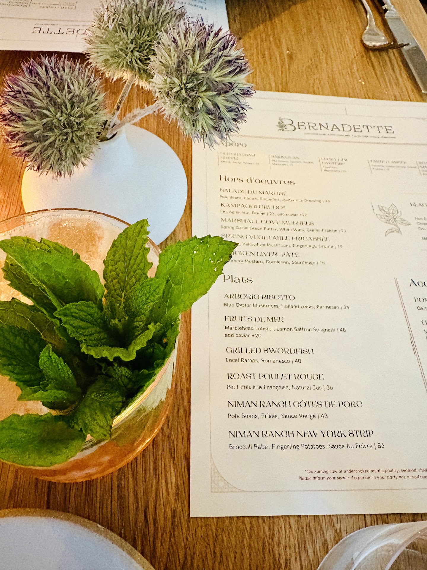 Boston Globe called this restaurant spectacular...we do not agree. Parking situation impossible. Restaurant extremely noisy. Food over spiced. We were there for one hour and 20 minutes. Our waitress named Kelly, after taking our order, disappeared. We had to flag down bus girl with the armed tattoos to get Kelly to come back to our table. Every request for anything...salt, our check...took way tooo much time. Ordered the most expensive dish on the menu, ribeye steak, and we were told it was ala cart, which is ok. Naturally one likes to have mash potatoes with one's steak so we noticed that on the beef bourguignon the mashed potatoes were available and there were potatoes in the salad frisee that had the egg. So when I asked the waitress, Kelly if we could purchase a side order of mashed potatoes, she responded that the chef is adamant that you cannot get mashed potatoes because they are accounted for with each beef bourguignon order. So we decided to order the beef bourguignon (in addition to our steak and pay full price) because they have potatoes and ask the waitress to keep the beef bourguignon in the kitchen but just give us the potatoes but alas she never came back. She would look to the left, to the right and in our direction but never directly at us, even though we were waving our hands to get her attention. Boston Globe should fire its restaurant reviewer and...