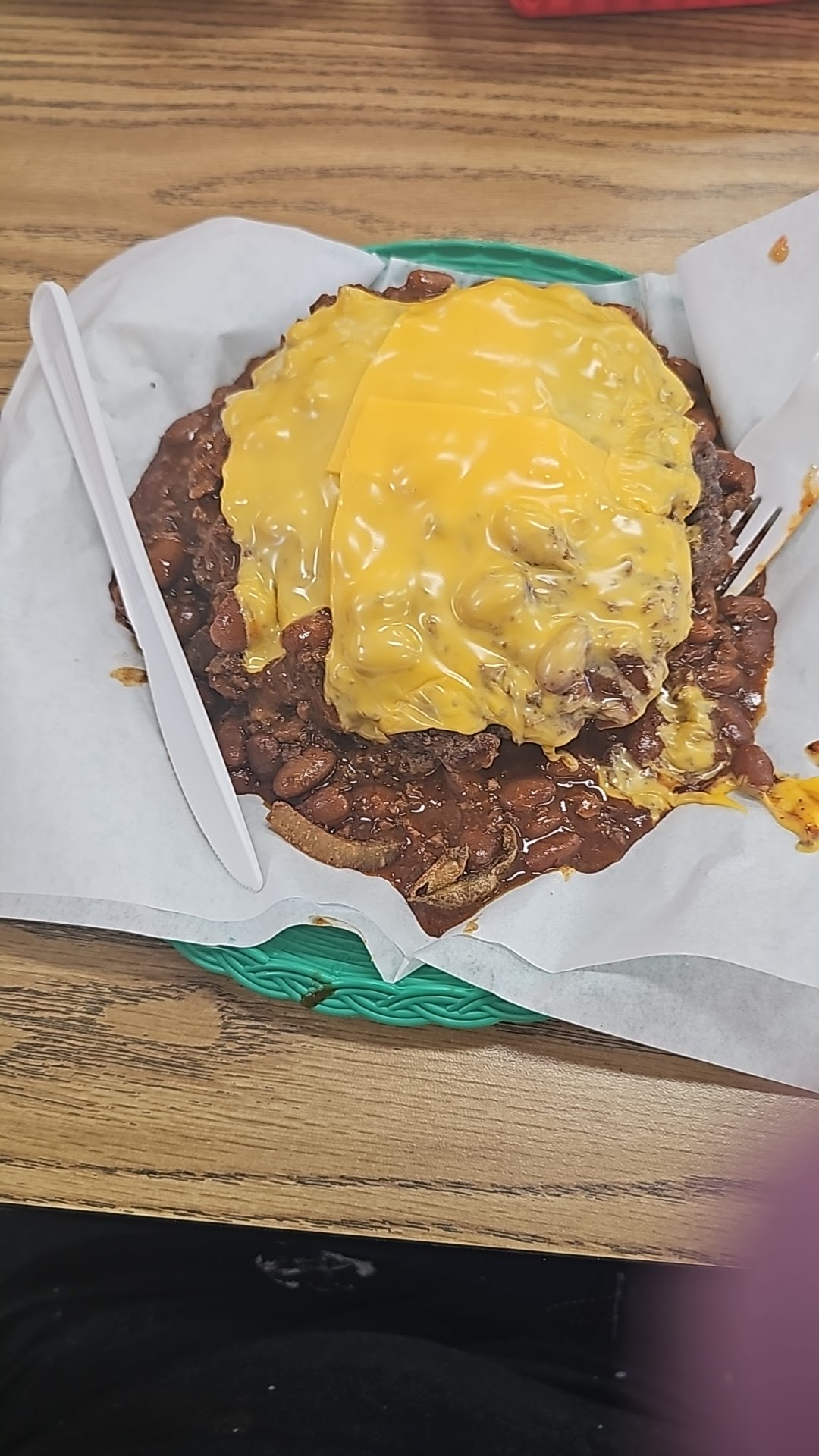 I ordered a giant burger with Chili, Cheese and 2 extra patties and no buns. I didn't realize that the patties were a half lb each. I managed to finish it, but it was a challenge. It was delicious! Next time I'll get it with only one extra patty, though. Lol.