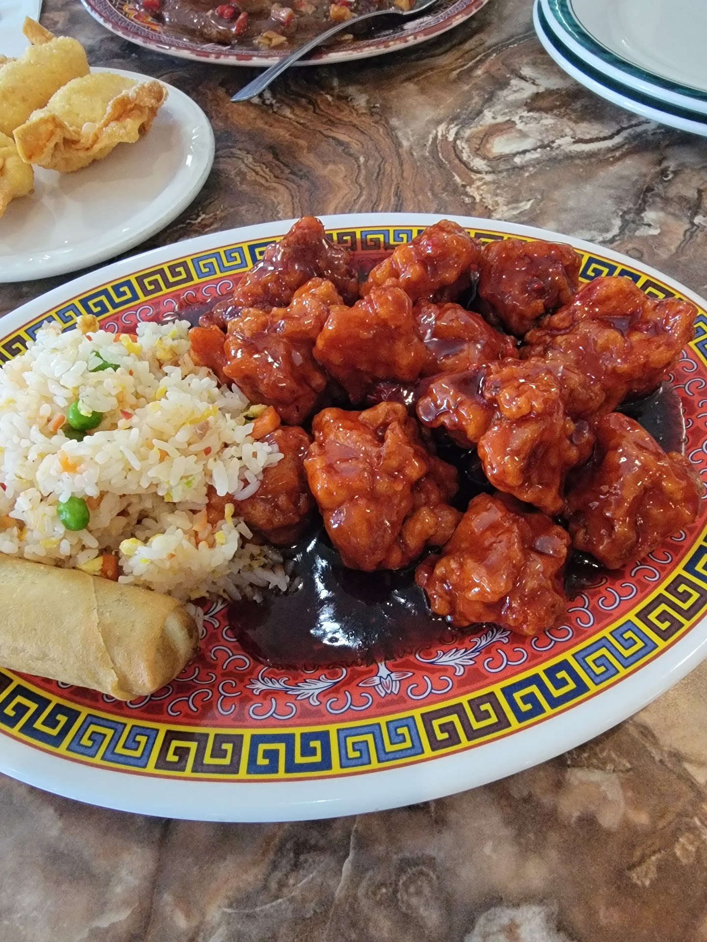 But im sad to find that their General Tso recipe has changed. Its not that super saucy deep red sweet/tangy sauce anymore. It is a general orange-ish sauce. Still has a tangy/sweet. But completely different flavor profile, a lot of black pepper, not the red peppers youd find in the original al red sauce. The portions seem to be a good size, and we also ordered chicken fried rice which seems to be about the same.