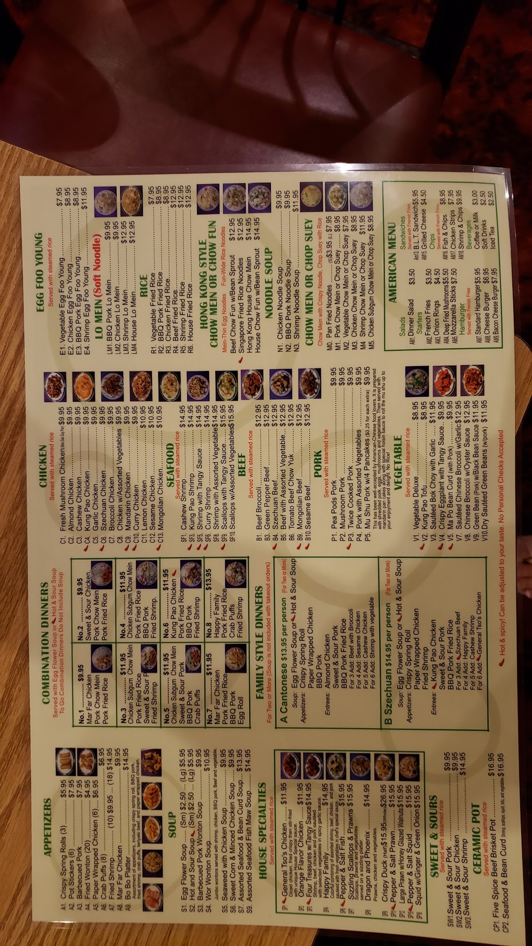 Read moreLovely Decor! Felt like I was stepping back in time to the 50's, 60's, 70's in Chinatown San Francisco! The Menu was simple, the dish (mine & my dining partner) was great. I had a combo #7 & my dining partner had a combo #6. The BBQ Pork was quite fresh & didn't have that yuckie unneutered Pork taste or smell. That's a big, HUGE gold star for my taste. The Fried Rice had a ton of Veggies & BBQ Pork in it. I can say without a doubt it is my favorite Fried Rice yet. The Egg Flower Soup was flavorful & had Tofu in it. I forgot to take a photo of it, as I was enjoying it so much. The Mar Far Chicken was lightly breaded, nice chunks of White Breast Meat & tasted very fresh too. None of that weird old Chicken taste here! The Egg Roll was typical, chocked full of veggies. The portions were good, not too small & not huge. I only couldn't finish 2 pieces of my Mar Far Chicken. My dining partner's Kung Pao Chicken looked like artwork, very colorful. My dining partner enjoyed his meal, as well as his accompaniments, of BBQ Pork, Fried Rice, Deep Fried Shrimp & Egg Flower Soup. Our Server was nice, friendly & on task. We were the only 2 folks there. I hope they are normally busier, because they deserve to be. I only had a sneeze attack of about 6 or 7 sneezes, so obviously there wasn't a ton of bad additives in the food. Those that know my reviews, know that if I have a sneeze attack, then there are additives in what I am eating, that I am allergic to, that cause me to sneeze. The Hot Tea was quite nice & no charge for it. All in all, I would definitely & gladly,...