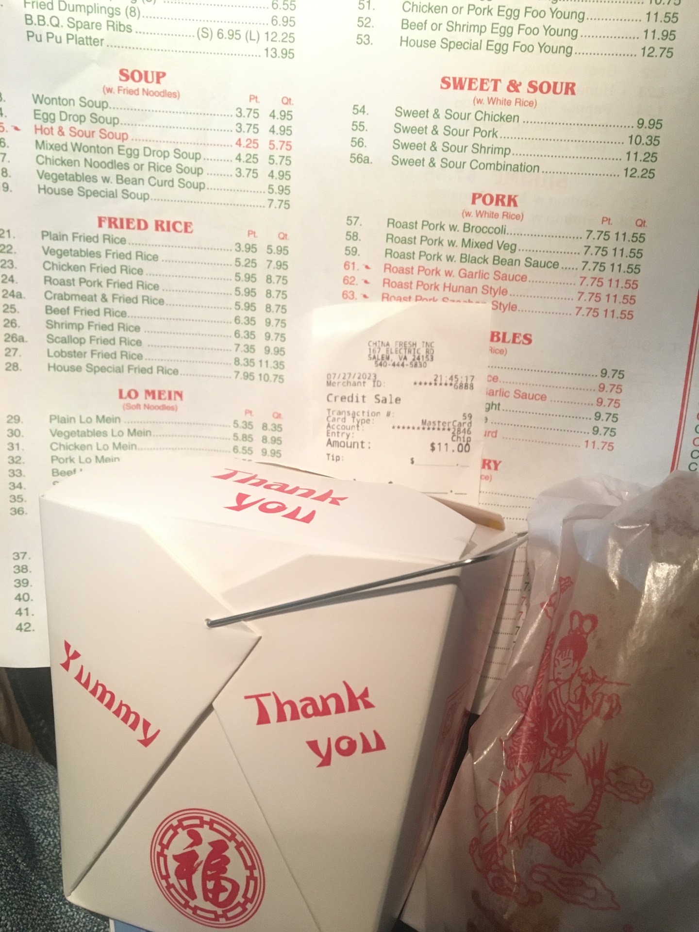 Read moreI came in at 9:44 PM on July 27th, 2023 and I ordered a pint of regular fried rice and one egg roll (image attached). The menu shows the price to be 3.95 for the fried rice and 1.85 for the egg roll. I was charged 11.00 for the meal. As I look at the size of my fried rice, it looks like a quart. It is possible that they charged me for a quart of vegetable fried rice which is 7.95 which would roughly be 10.00 before some tax, but this is not what I asked for and when I was given my order, the cashier recited what I requested. My total would be (if this is a quart of regular fried rice...) roughly 8.00-9.00. This was not what I asked for, additionally there are bits of pork in my rice. I have dietary restrictions from pork and shellfish, so I cant even eat this rice.
