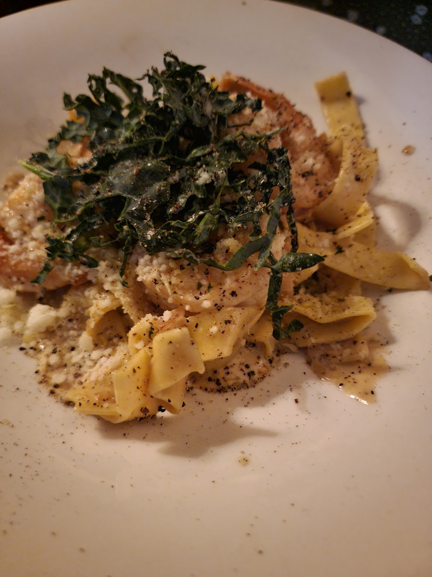 We ordered the Canary Melon Prosciutto for our appetizer, and then the Blackened Halibut and Lemon Prawn Pappardelle, and finished off with a Flourless Chocolate Cake, Winthropâs Special (Glenlivit 12 poured over vanilla gelato and salted caramel) and a Brandy Alexander.