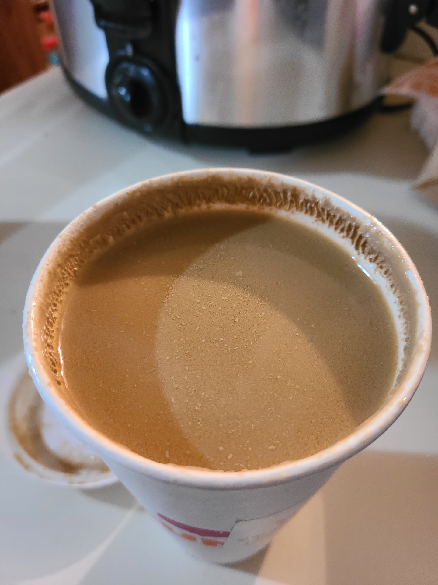Ā Ā Ā Read moreAbsolutely unacceptable and disgusting!! Went through the drive thru 10/30/21 at 2:07pm, ordered standard decaf cream and Splenda. The gentleman handed me my coffee, and I drove home. As I pulled into the drive way took a big sip and almost threw up. Got inside took the lid off and found this!!! Seriously?? What is this!! I've seen curdled cream before but never where a textured film forms on the rim of the cup. When I poured it out the top 3 inches were this odd light color with chunks and the rest was almost black. Never again will I go there!!! Absolutely disgusting and to top it off I tried calling and no answer, of course. Not even worth driving back because the customer service there is always less than pleasant if you know...