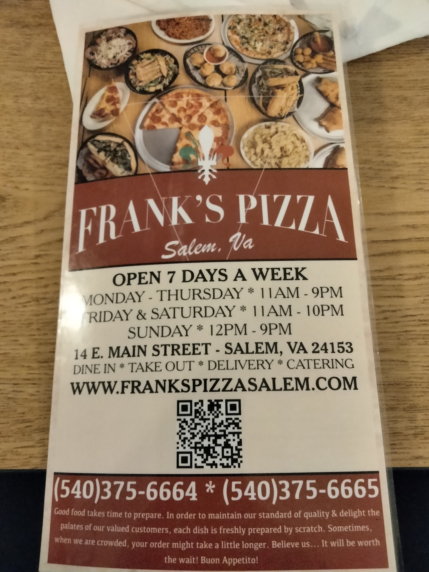 I realize each âFranksâ is owned by a different person... I worked at the one near Tanglewood & they were AMAZING at customer service & could always work with you for a specific order, all the while keeping things fair for both customer & their establishment. Today is Fatherâs Day &although we normally order from a diff Franks, this SALEM Franks was on our way to where heâs recovering at Salem Health & rehab from his stroke. This was a special treat for him bc weâre working on adjusting him to a healthier regime for eating. The experience was so UNNECESSARILY STRESSFUL due to the staff acting as ârobotsâ of a large corporation(as opposed to a small business that is flexible to some extent & uses common knowledge with their customer service skillsâ I wanted to order him a calzone with 5 vegetables,, which we do at the 3 other Franks locations by ordering the âCREATE YOUR OWNâ which is any 5 toppings for $9... & itâs not as though we wanted it fully loaded with their most expensive MEAT toppings- they charged us almost $4 MORE for the fact that OUR VEG CHOICES didnât include things he doesnât enjoy eating- such as in OLIVES, broccoli, etc... Staff as nice enough when picked up ordered, but thatâs probably bc WE TIP ON TO GO ORDERS... POINT BEING- they shouldâve went to a manager if they were for whatever reason incapable of substituting ONE 50 cent VEGETABLE TOPPING FOR ANOTHER (same priced) VEG TOPPING. Basically UNNECESSARY STRESS & rip off of their customerâs money due to NO ATTEMPT AT BEING FLEXIBLE (which would cost them ZERO $$$$) Aggravating to...