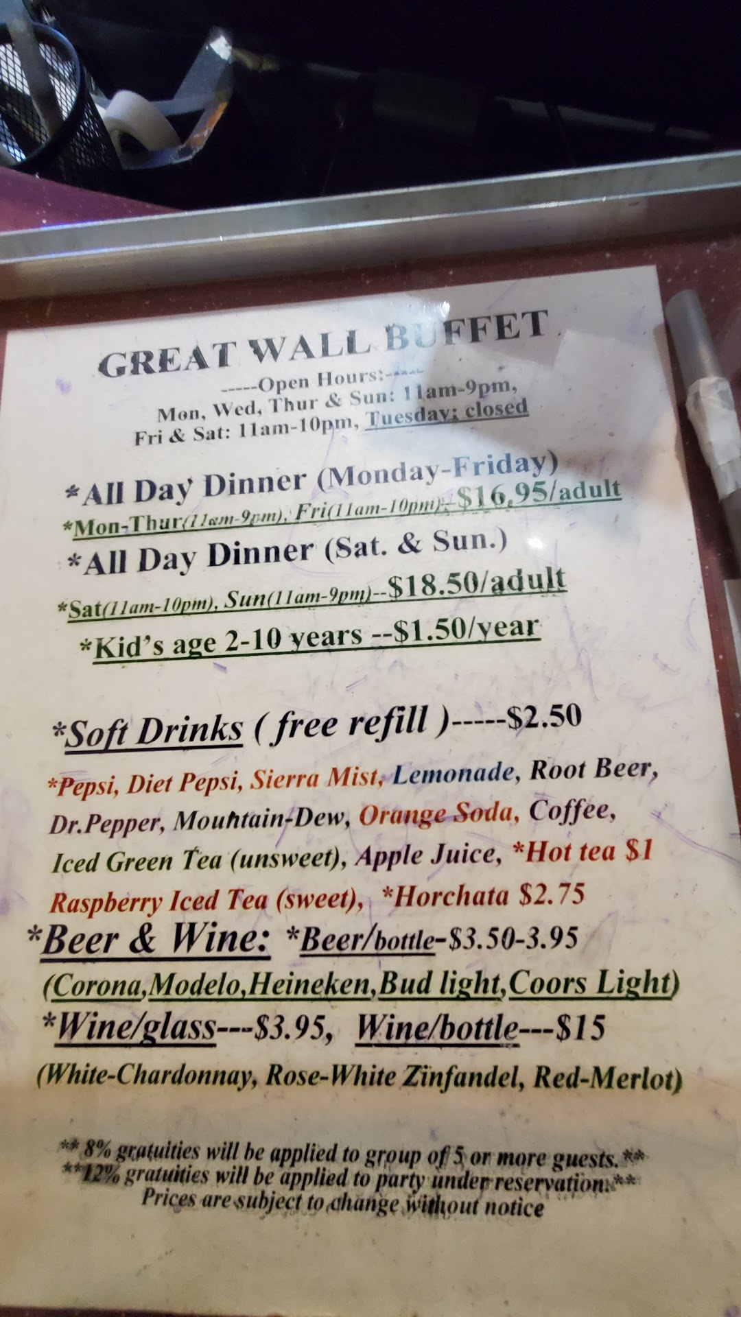 Read moreBelow -0 rating. We had a wonderful time, not meal, when we arrived. The food wasn't the best but edible since we had spent a fortune on it anyway. I had three adults and three children. A four year old, a three year old and a 9 month old baby. My 9 month old baby was in a highchair. We were eating and talking enjoying our time and my baby had made a mess. Usually when a child makes a mess the parent doesn't spend the whole time cleaning up as it falls....so the parent can eat too..but then the manager comes to our table asking if we were going to pick up after our child. We started to explain then he started getting angry with us telling us we were wasting food and just making a bunch of mess and just complaining about us. Then finally he asks "You're American, huh?" I don't feel the need to explain much further. Needless to say we werent happy with him about asking that so after the conversation we just left. Great Wall does not have very good customer service. I understand we made a mess but we weren't finished eating either. It's not like we sit around at home or around restaurants just leaving messes and being disrespectful. He's a baby. We would have gotten to it. Customer is always right. Learn some...
