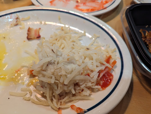 Read moreUpdate, Oct. 2023 So, we really like to have breakfast for dinner once in a blue moon, and IHOP is convenient for that, so we tried this place again. Our server was super timid and only showed up to take our order, drop off the food, then the bill. Never checked on us once in between to check on things. Most of the food was okay, but I don't think the cook knows what hash browns are supposed to be like. Ours came out white and barely warm, uncooked and inedible. Couldn't complain because our server was AWOL after dropping off our plates. I complained about the hash browns when we finally got our check, so moments later I was brought a togo container with a pile of hard, scorched, burnt smelling, potato shreds. Gross. Cook was obviously being petty for the undercooked complaint. How do you work for a breakfast joint and not know how to cook hash browns? The dinning room was empty for a reason I guess. Lots of lounging employees and no customers should have clued us in. Pretty sure we saw someone buying/selling "something" from an employee as we left. Yikes. I love a good IHOP, but this is definitely one to AVOID.