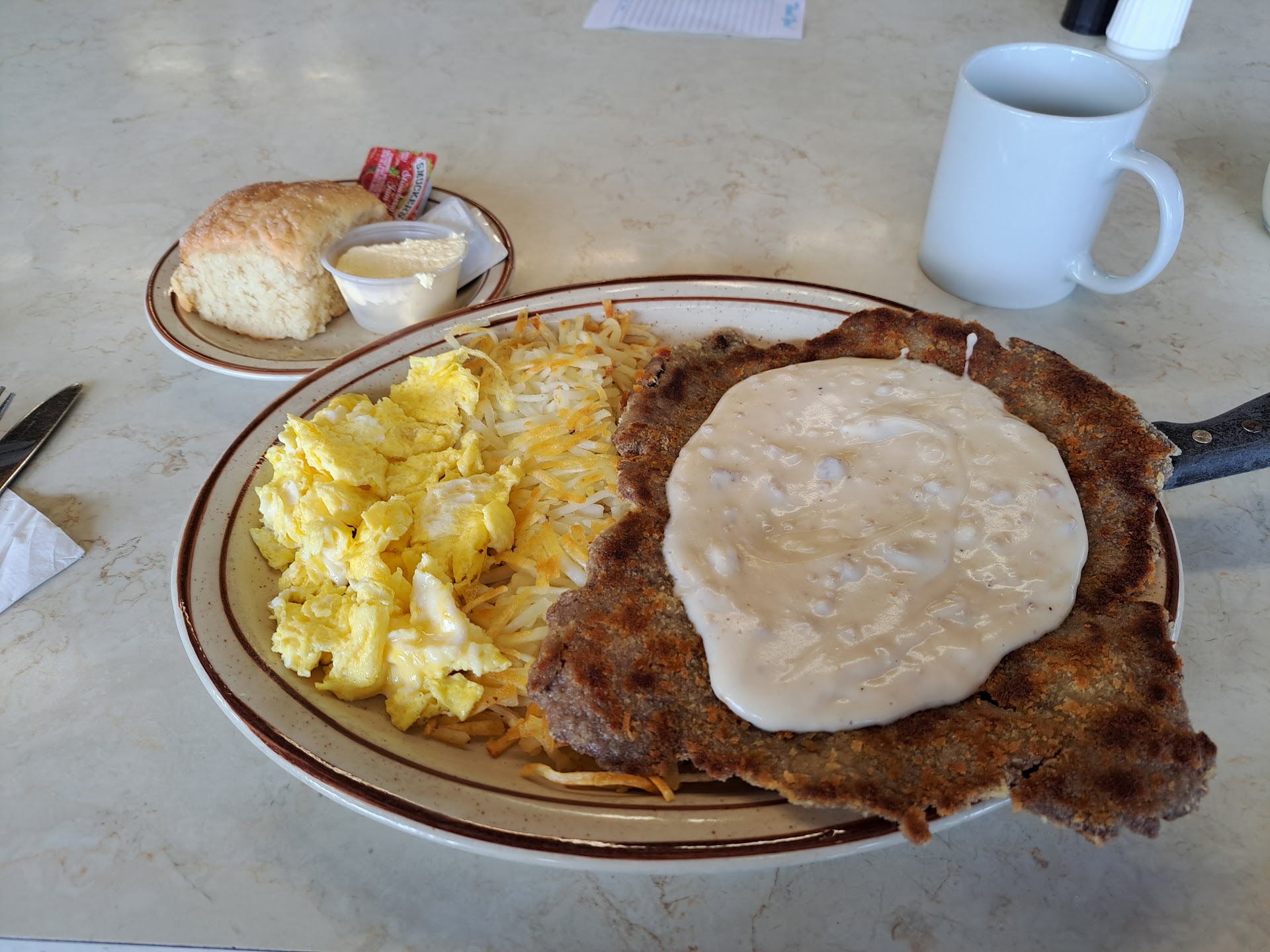 Read moreThis is my second time going so let’s summarize both First time: Breakfast Order hashbrowns eggs bacon with a side of gravy. Did not finish the meal. The gravy was crazy sweet I asked for crispy (extra cooked hashbrowns) they still came slightly under done and over medium eggs. They were over easy. Paid $22. Only good thing was my hot cocoa. Servers were nice