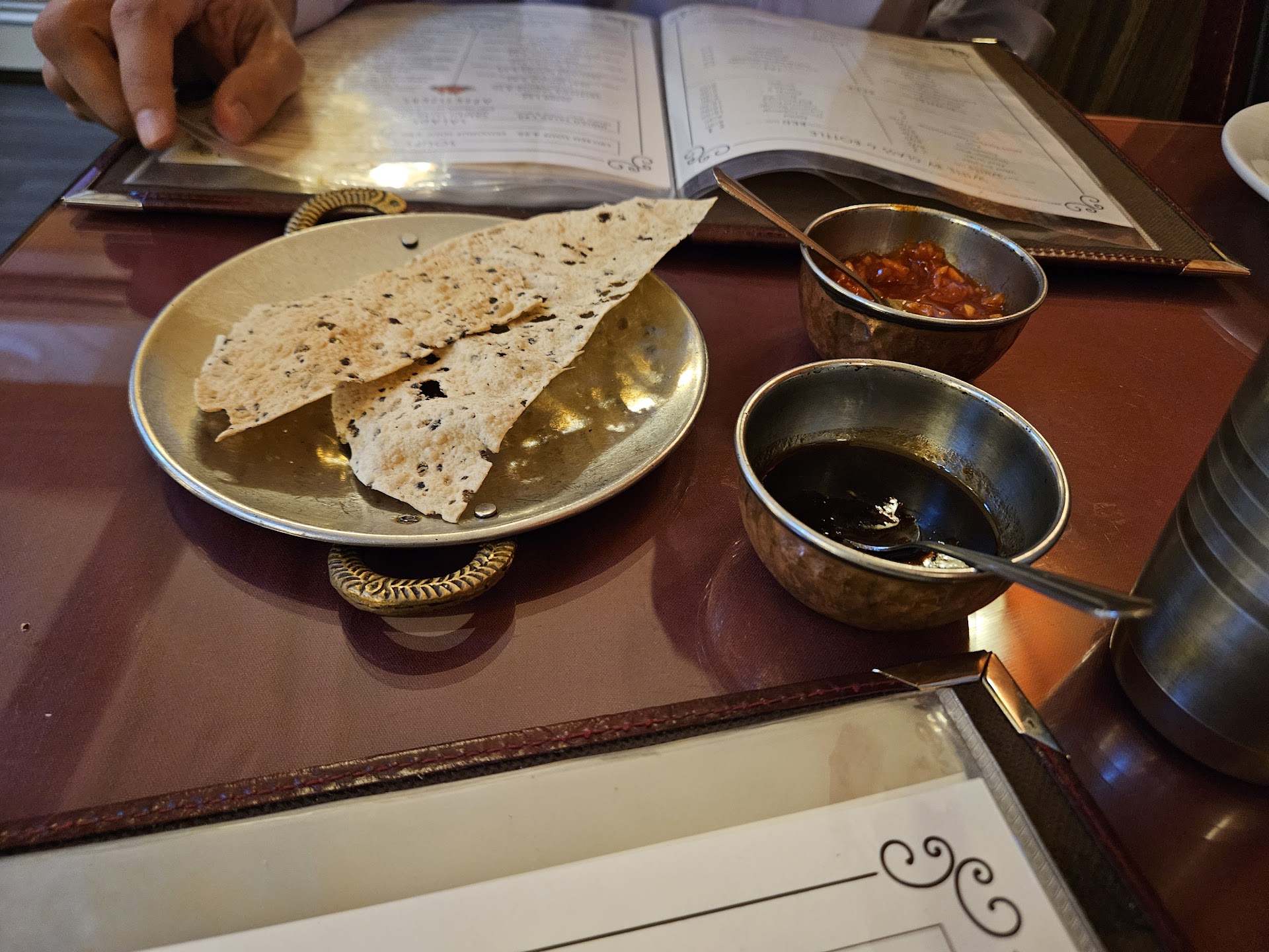 Ordered: chicken Tikka Masala, Mango Lassi, Shrimp Pakora, Garlic Naan,