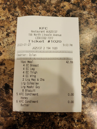Ā Ā Ā Read moreWe stopped here on a long trip home, so it was a little later, like 9:45. They were out of most of the things that we wanted and wouldn't make more. For example, I wanted a crispy chicken sandwich and someone in front of us ordered tenders and she replaced my filet with 2 tenders on the sandwich. My daughter got two chicken legs and there was barely any meat on there. We wanted extra crispy and they only had original. They said they were out of biscuits, so we asked what they would replace it with and she said a small side. So, we asked for another coleslaw. We waited until the chicken tenders were done (about 7 mins) and she brought our food out and said they "found" a biscuit. Like, where?? Lol We usually love KFC, but lately, it's been pretty bad with being out of products. I think we'll be headed elsewhere...
