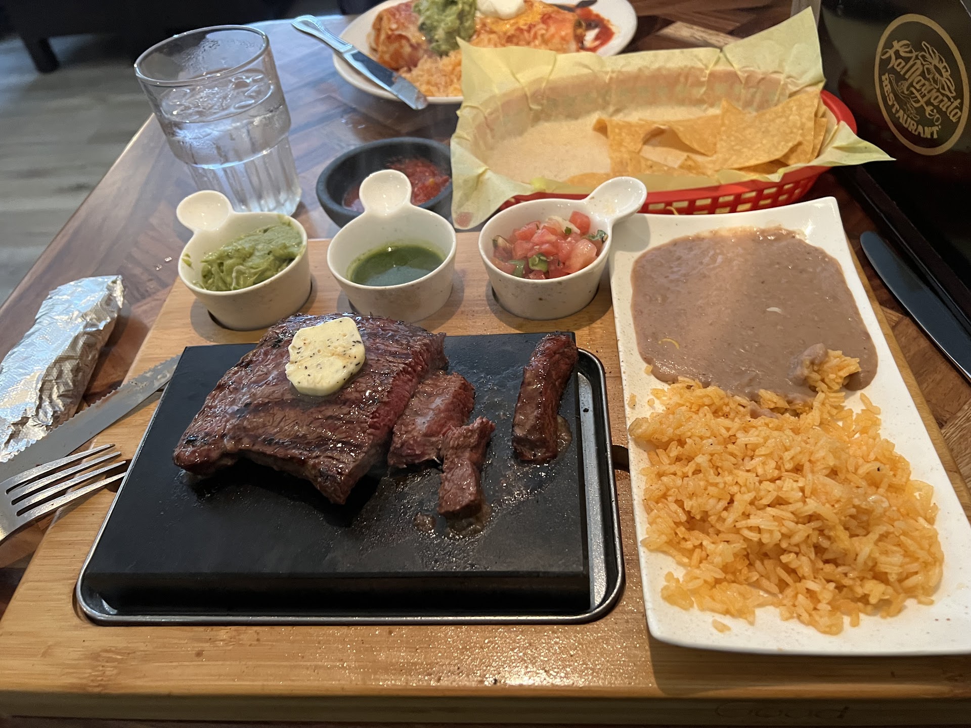 Fajitas arrived with a very faint “sizzle” and the fajita platter was luke warm/able to touch it with bare hands. The set up plate had a large serving of sour cream and of course it was touching the rice, beans and guacamole.