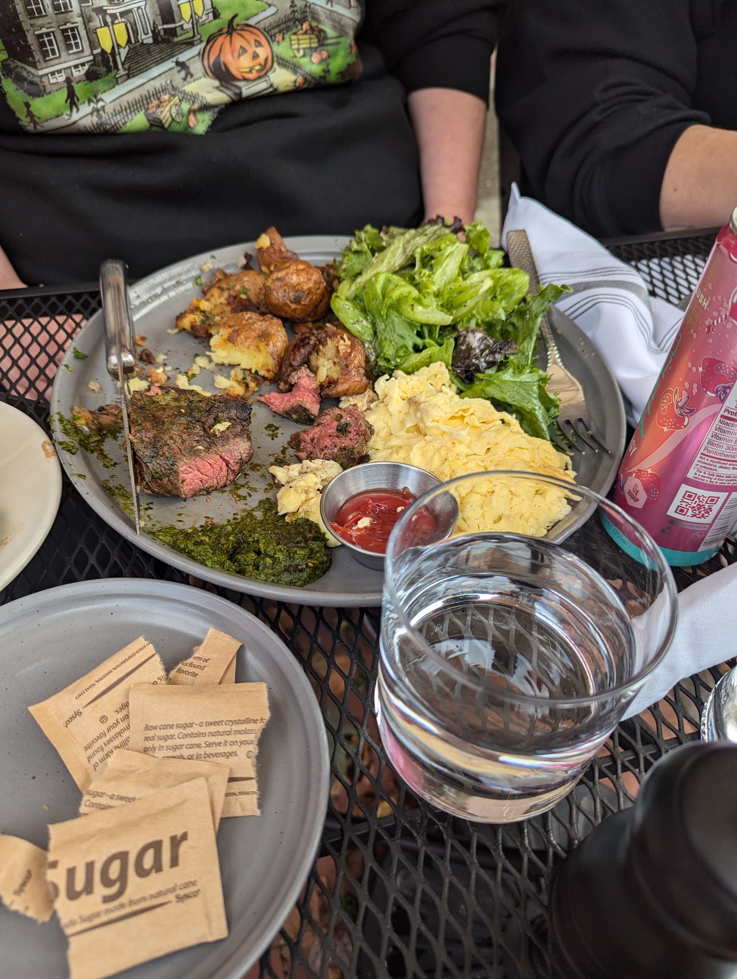 So knowing that information, we were lucky if the server checked on us 3 times. She barely said anything, when our friend who took a little longer on the menu was going to order she gave him an attitude bc she seemed in a rush. The 'steak' knives might as well have been butter knives. The food was basically just 'edible'. Only one person in our table of 4 finished more than half the food. The Salmon tasted like it had been sitting / possibly hasn't been bled out properly as it had an irony taste even while thinly sliced. The avocado was piled completely on and overpowered the taste of everything except the fish (which wasn't an enjoyable meal). The steak was extremely tough. The potatoes were okay. The eggs were unseasoned and covered a massive part of the plate. The pesto was borderline flavorless. The salad was drenched in an extremely sour dressing. The pastrami hash had no flavor. The eggs were undercooked (supposed to be sunny side up) and completely unseasoned. The whole dish had to be coated in salt and pepper to even be edible. The salad was overly drenched in this sour dressing that made it inedible The blueberry Dutch baby was the one thing that was good. No complaints on this.