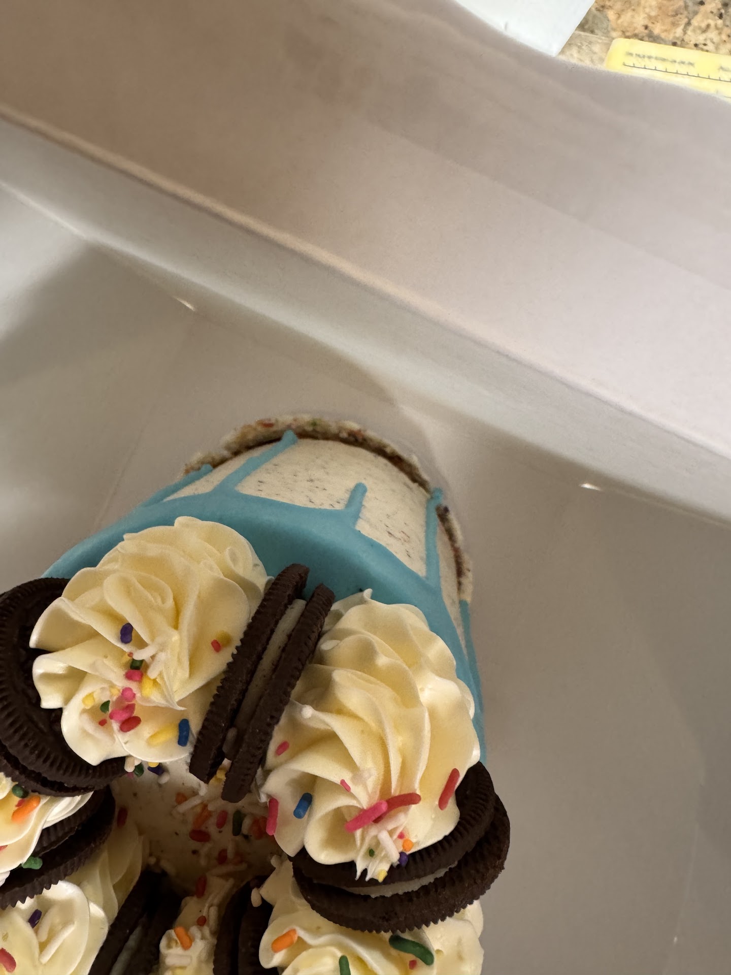 Read moreI ordered the small (5 inch) Funfetti Oreo cake for my son’s birthday. The cake itself was absolutely delicious as was the exterior Oreo fingertip frosting. We all felt that there was too much of the Oreo buttercream. There was 4 thin layers of the cake filled with thick Oreo buttercream between each layer - which was really an overwhelming amount of buttercream. Every person’s plate had loads of Oreo buttercream left on it after picking through to get the cake. I think this would be much better with 2-3 thicker layers of cake so you get a greater cake to buttercream ratio.