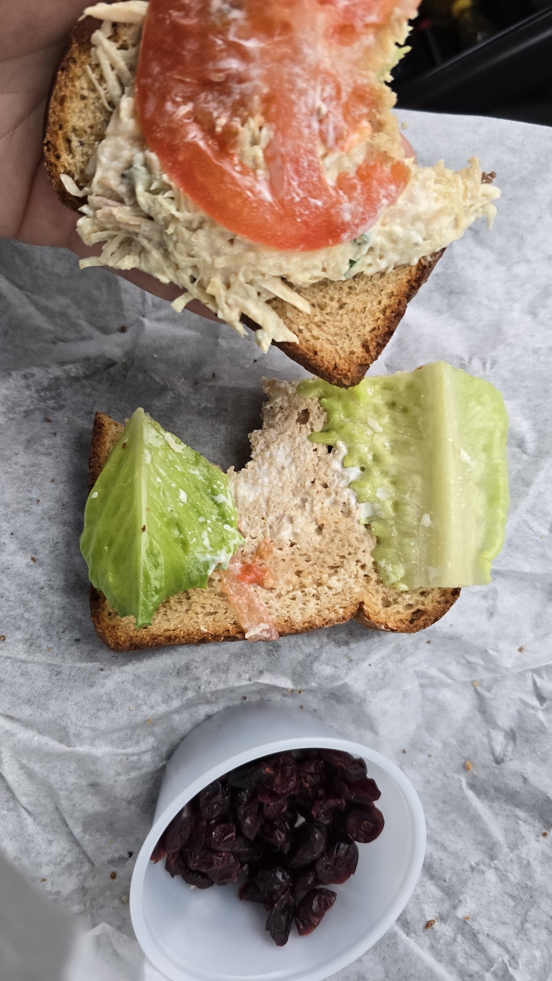 Read moreI wasn't very impressed by the atmosphere (a lot of clutter near the entrance), and I wasn't super excited to buy a 10$ sandwhich, but I was in a rush. I had taken the time to look at the menu on here and decided I would get "The Clucker". A simple chicken salad sandwhich that is supposed to come with cranberries, lettuce, and tomatoes. Customer service was average, and I was surprised when I saw that the actual price was $14.25. If I had known I was going to pay almost $15 for a sandwich, I wouldn't have come, but like I said, I was in a rush. Whatever, I ordered the Clucker and after about 10 minutes I received my sandwich. The chips and pickles it came with were wrapped in some plastic baggies (the pickles were dripping juice, poor packaging), and the chips were fine. Finally, I got to the sandwich. Average size, but hopefully, it's good! I had chosen to get the wheat bread, and boy was it so disappointing. I opened it up and saw that the chickensalad didn't look to have any cranberries. I took a bite and no cranberries to be tasted.