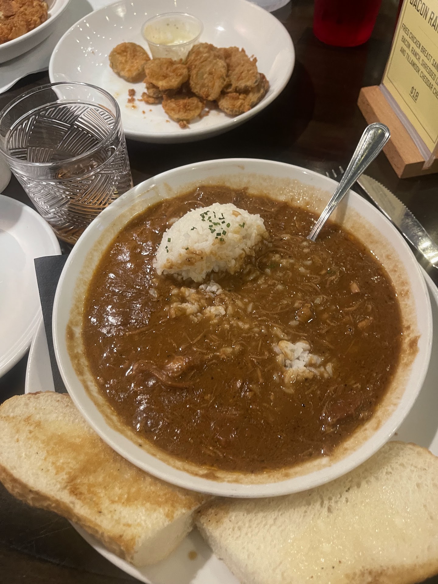 I was just here yesterday, my mother wanted to go here for her birthday dinner and we both never been there before. We were a table of four and it took them 15 minutes to come and ask for drinks but it was super slow for being a Friday at most there was 5 tables besides ours and that should’ve been the first red flag. Luckily we ordered our food when the waiter came and ask for drinks because I felt like it would’ve been another 20 minutes until they came back. We got the fried pickles and they were super salty but we didn’t want to be rude. My mother got the gumbo and it was decent( then again we’ve never had gumbo before)me and my fiancé got the chicken sandwich and it tasted exactly like a Popeyes chicken sandwich. The waiter never came back to ask how it was or anything, my little sister’s cheeseburger came with ranch (she doesn’t like ranch) so I kindly ask if she could have some ketchup instead the lady was super rude about it as if we were bothering her. Later we had to go up to the counter and ask for boxes and my mother barely touched her gumbo so we asked if the gumbo could go in the box without it leaking, she again had an attitude about it saying it’ll be fine and my fiancé asked the gentleman instead and he said it would leak and gave him the correct container for it. Overall I was super disappointed especially since we were all excited because of the reviews but their service was horrible I would’ve understood if they were busy but again it was very slow. I would not recommend this place not even for their food and especially...