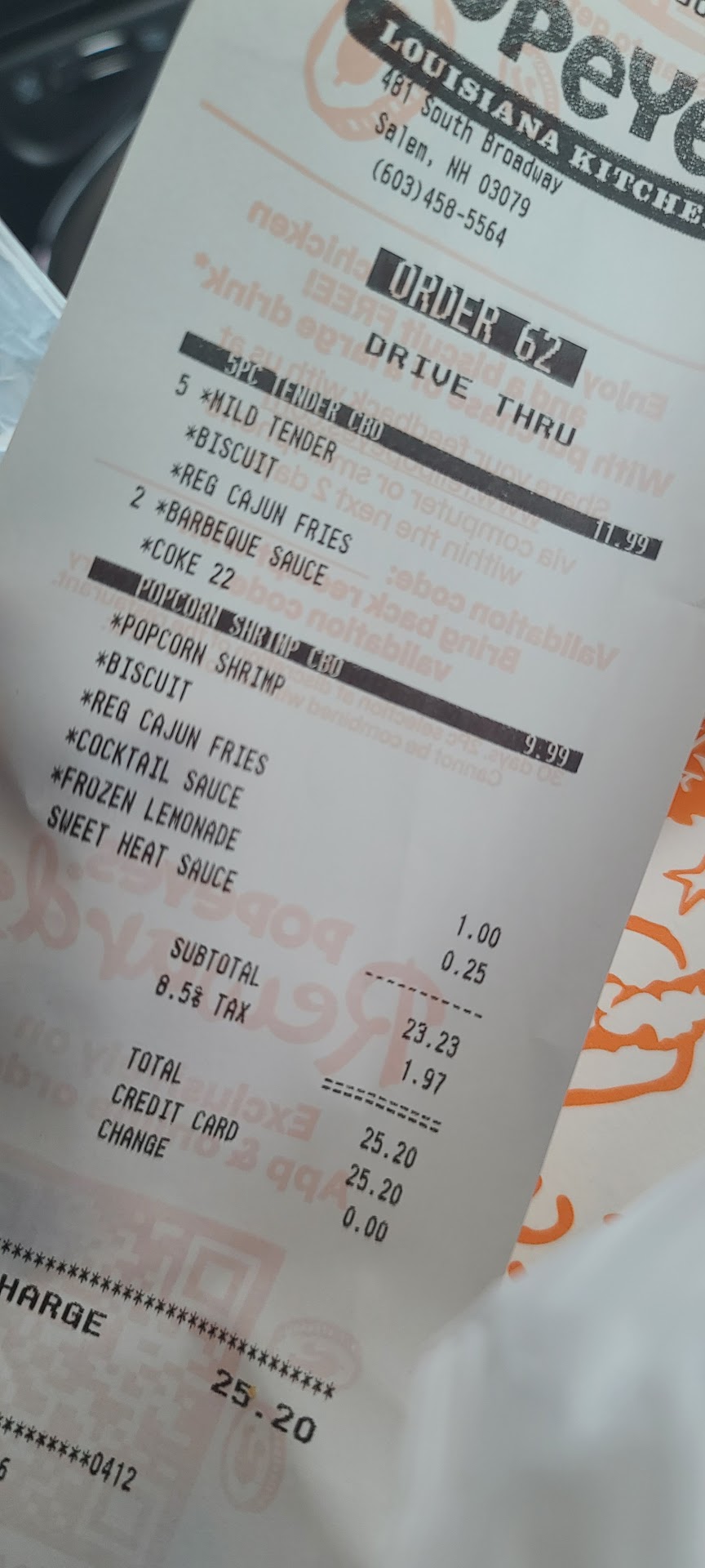 Read moreWhile there was nothing wrong with food, I really cannot give it a better than 3 star rating when it is not what you ordered. This explains the 1 star service, as my entire order received was not what I ordered. And it represents a comedy of errors too, as my order placed was for 2 Classic Flounder Sandwiches and a large Insweetened Ice Tea and what was given to me was 2 Spicy Flounder Sandwiches and a large Sweet Tea, which pretty much means I wasn't handed the person behind me order. Of course I did not discover this until I drove home. And before writing this on line review, no one answered the Popeyes #11450 Salem NH number and the tellpopeyes survey wanted more information about my household than I felt comfortable giving out before being able to write about my problem. It also took 15 minutes of wait time at the drive thru to get this incredibly wrong order, a order that fed my trash can more than me as I dumped the drink and only ate half of the one sandwich before tossing number 2. All for $14.40. Granted the receipt does list Sweet Tea, which means the person who took the order misheard me or hit the wrong button when I ordered Ice tea unsweetened but tge Sandwiches are clearly Classic Flounder not spicy as received. I love Popeyes and look forward to the Lent seasonal Flounder Sandwich but think I am good...