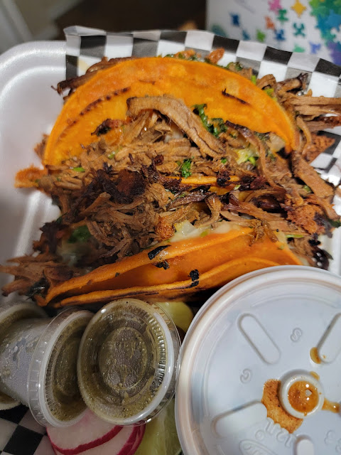 Significant other has heard of this food truck on social media recently, and so we had to give it a try. Redline is tucked deep into a strip mall parking lot off NE Lancaster near the Les Schwab, in the same parking lot as Lucky's Pub #3. We ordered the Double Smashburger, Quesabirria Combo and an Asada Street Taco.
