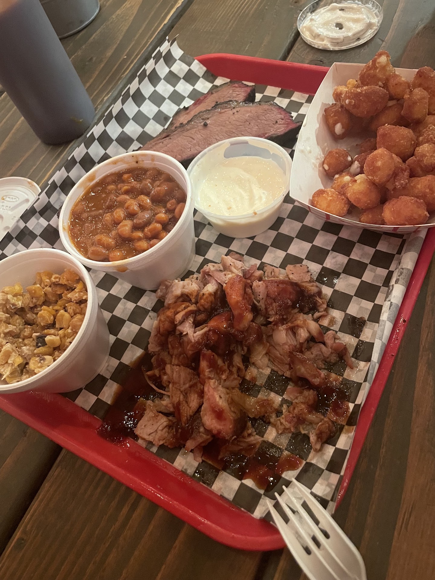 Read moreFull disclosure, we arrived a half hour before they closed so some of my complaints are likely due to being the last customers of the day. First time trying this place and was unfortunately not impressed. Shared a 2 meat and 2 side plate. The brisket was tough/dry and the corn side was also dry and bland. This is likely due to being cooked earlier that day and being kept warm until they closed. The pulled pork was tender, juicy and flavorful but unfortunately all our food besides the beans and cheese curds came out very cold. Didn’t get to try the potato salad or Mac and cheese because they were out, again our fault for being there at the end of the day. I would give this place another try, but get there when they open for hopefully higher quality.
