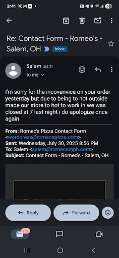 Ā Ā Ā Read moreIf I could give 0 stars I would. I originally learned of Romeos Pizza in salem off of one of the Salem, OH chats. On July 30th I placed an order at 6:52PM for delivery. My order never came. I went to the store and there was a note that said due to the heat they were closed. I reached out through there contact us form and received 3 different stories as to why they closed and the one manager said they closed at 7. This would have been 8 minutes after my order went through! I was then told that the store couldnt control what the owner did with online orders and that the note on the door is the only explanation that the store owes anyone after I suggested they also utilize social media to alert the community of any closings and it would take 10 to 14 days for my refund to be processed. Here it is August 19th and still no refund! I have also reached out to there corperate office with no reposnse there either.