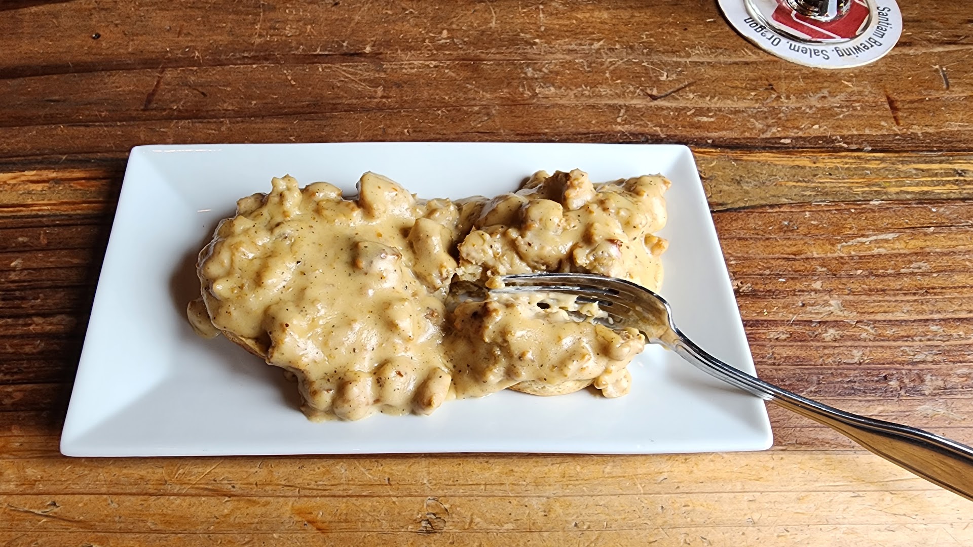This was not a good experience. We have been going here since they were just a counter to stand at and taste their delicious beer. We had heard about them serving breakfast and were eager to give it a try. The first table we tried was dirty with crumbs all over it so we went to the next table and at first it appeared to be clean but when we sat down there were eggs all smashed into the table so we went to table #3 and it was satisfactory. We sat down and waited for quite awhile before they took our order. They were out of what my wife had ordered which is understandable so we both got the biscuits and gravy and she ordered 2 eggs over hard and some breakfast beans for us to try. It took about a half hour to get our food and it looked like it hard been sitting under a warmer for a bit. The over hard eggs were over medium at best and they never brought our breakfast beans. The size of the serving of biscuits and gravy was ridiculously small for $10. It was incredibly salty and the biscuit was so hard you couldn't cut the edges of it with a fork. We returned the eggs and asked for them to be taken off of our bill since we didn't want to wait any longer to eat breakfast. When they brought us our bill and we explained about the experience the waitress argued with me about whether or not the tables were dirty and said that she had wiped them down that morning. I said well they were dirty when we tried to sit down so we had to try three tables before we got a clean one. She continued to argue and I said I'm not lying I have no reason to make up that the tables were dirty. I would have given the service more stars had she not argued with me about whether or not the tables were clean. To their credit they did comp us our two beers that we got so we appreciated that. Since we've been going there for so long we will go back for the beer and maybe the fish and chips but other than that I don't think that Santiam Brewing will be a place...