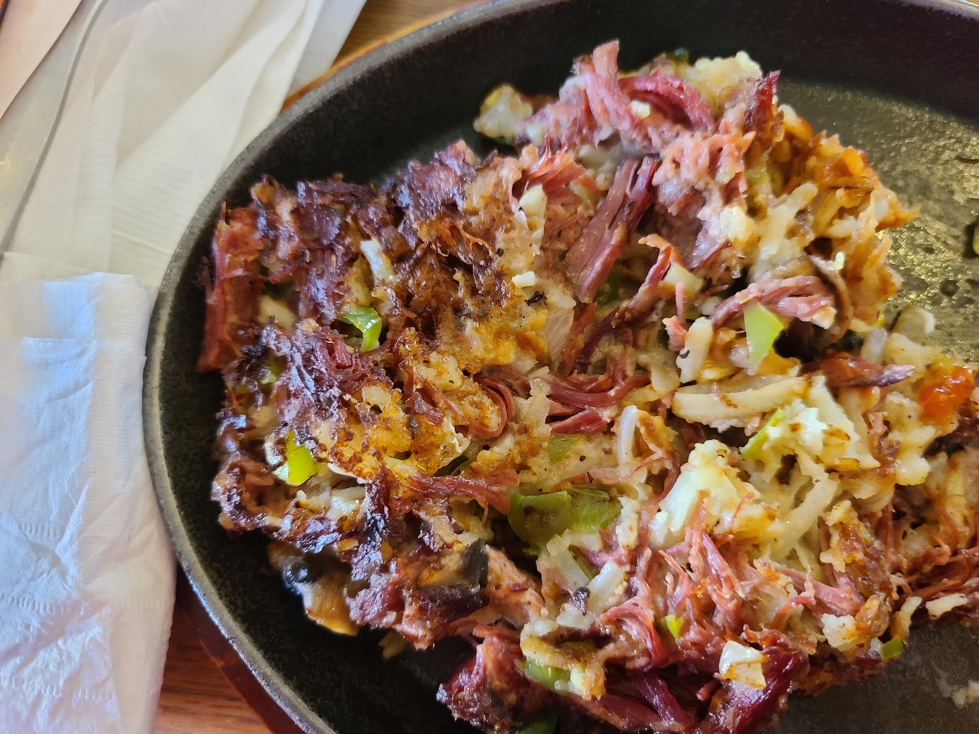 Now on to our order. My husband decided to try the biscuits and gravy meal. The eggs were cooked and came out hot. The sausage was also hot and tasty. His biscuits were nice and fluffy but as stated in other reviews his gravy was meh. I ordered the corned beef hash and poached eggs. It was delicious if you like corned beef hash go with this.