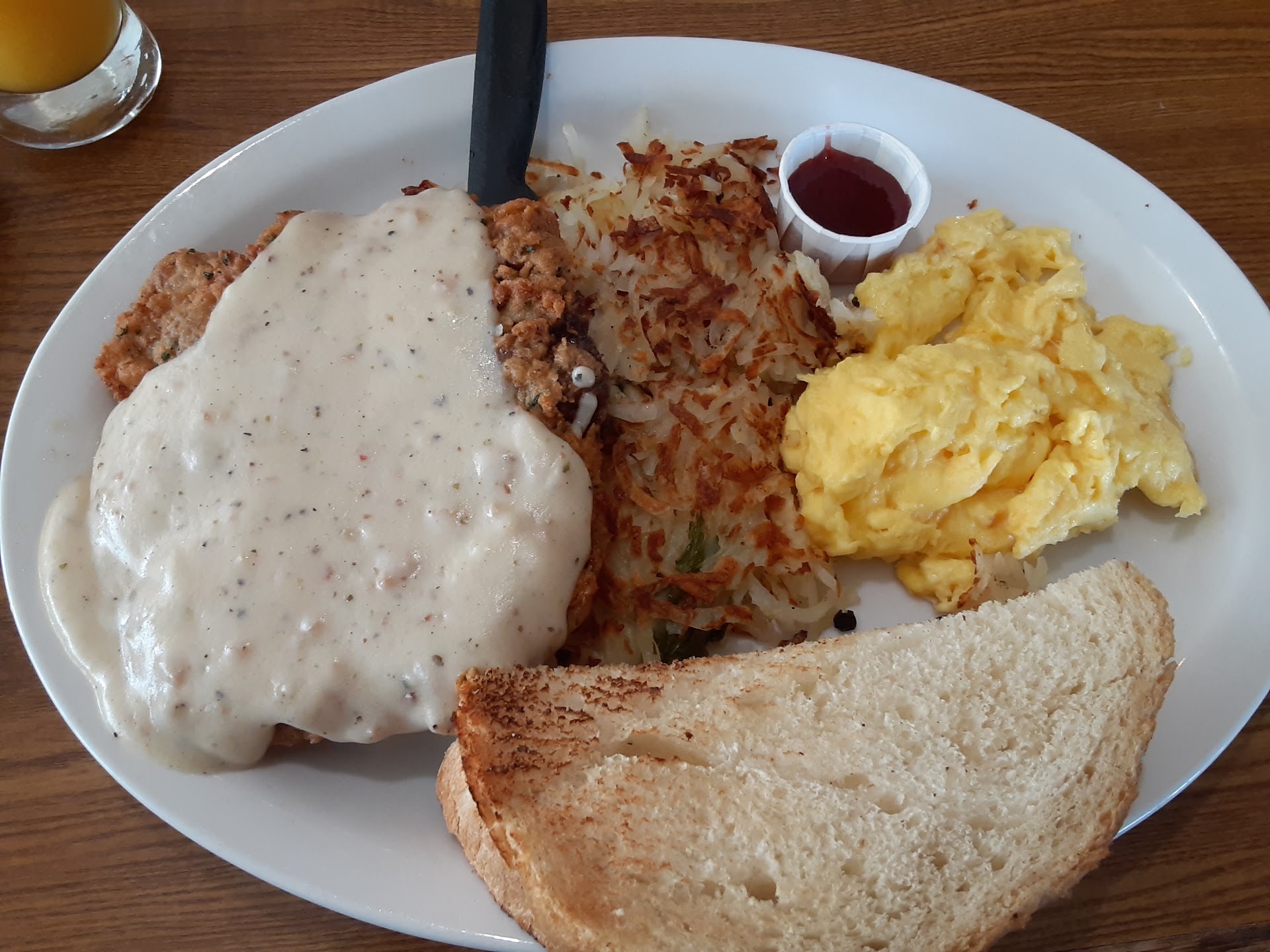 Read moreI had to try this location and was VERY curious as to what they kept from their catering small buisness days. We had the buisquits and gravy, side of bacon and eggs...bacon was great, gravy was bland but good, buisquit was heavy even though looked light. Overall not what I thought it would be at all. We also had the fresh bread (very good), homemade strawberry jam (tart but good). The chicken fried steak...super thick, breading was sliding off of it and bland. My eggs were scrambled but runny...ewww. When asked how things were, I told Bryce (a HUGE asset to this buisness) and he had them make me done ones and, brought them wile they were hot. The farmers breakfast has some brat looking sausages and they have good flavor but fatty. Orange juice was real stuff. Water is not filtration so seriouse chlorine taste.
