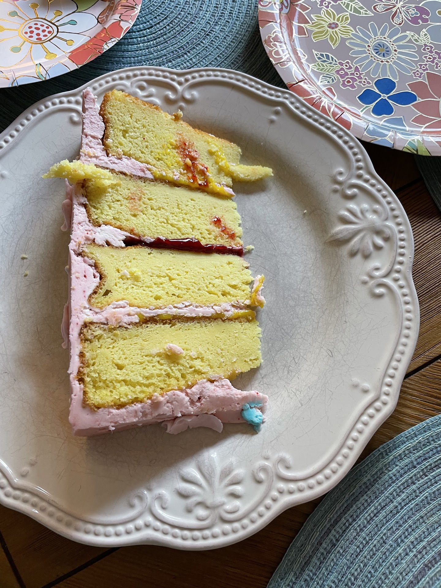 The absolute cherry on top though, was the fact that they didn’t have a proper box to transport the cake. A single tiered, 3 layered, 6” round cake, and they didn’t have a box that fit.. The employees solution was to tape parchment paper to the top of a small box and “hope the lid doesn’t fall”(I’m almost certain that this is the same employee who took my original order too). Thankfully, another employee had the sense to recommend tapping two boxes together for a sturdier option.