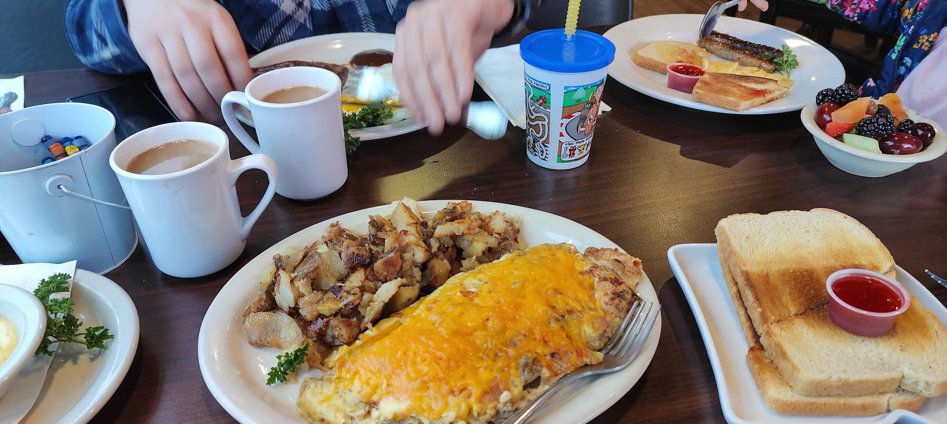 Read more1st time here for my boyfriend and I. We read the reviews before getting here and they were not good but still decided to give it a try. He ordered the French toast breakfast and I ordered the all meat omelet breakfast. His French toast was not cooked all the way and super soggy, the eggs were fine. My omelet was fine. I asked for country gravy to be poured over it and they poured it over the potatoes instead. My toast was soggy and loaded with butter. The potatoes are cut fresh etc but absolutely no flavor. I ordered water to drink as usual and he had coffee. Half way through drinking the coffee he noticed a hard thing stuck to the inside of the cup to what looked liked the skin from a peanut or something similar. He brought it to the waitress attention and she said it is stained. A stain is not a hard piece of whatever it was.When we received our food it was not hot as it should have been because as soon as the cooks set it up on the heat lamp to be brought to our table, the waitress brought it right away, so there was no reason it was not hot.We tried it and will not...