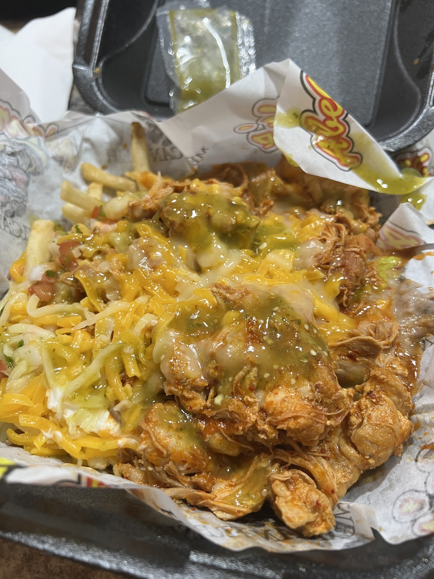 The asada fries are a whole different issue! 1st full order great perfect, 2nd full order was less cause it was put into a divided container, 3rd better but still less than the 1st. Now this last time pissed both me and my husband off. We ordered a full size of asada fries, what we got was maybe the size of a half order, honestly looked like less and the fries were under cooked.