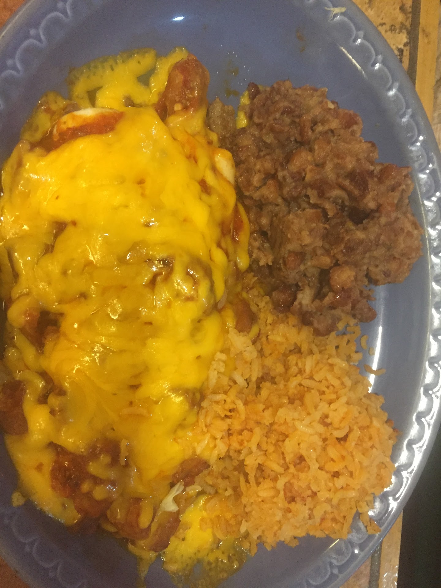I ordered a smothered sancho, my wife ordered a plate with a cheese enchilada and a taco, and my daughter ordered a chicken quesadilla. The food came out quickly and was hot. The smothered sancho was pretty good. The white queso was delicious, the ground beef inside was okay and could have used more seasoning. My daughter enjoyed the quesadilla, and called it a meatadilla as it was 90 percent meat and 10 percent cheese. My wife enjoyed her enchilada plate.