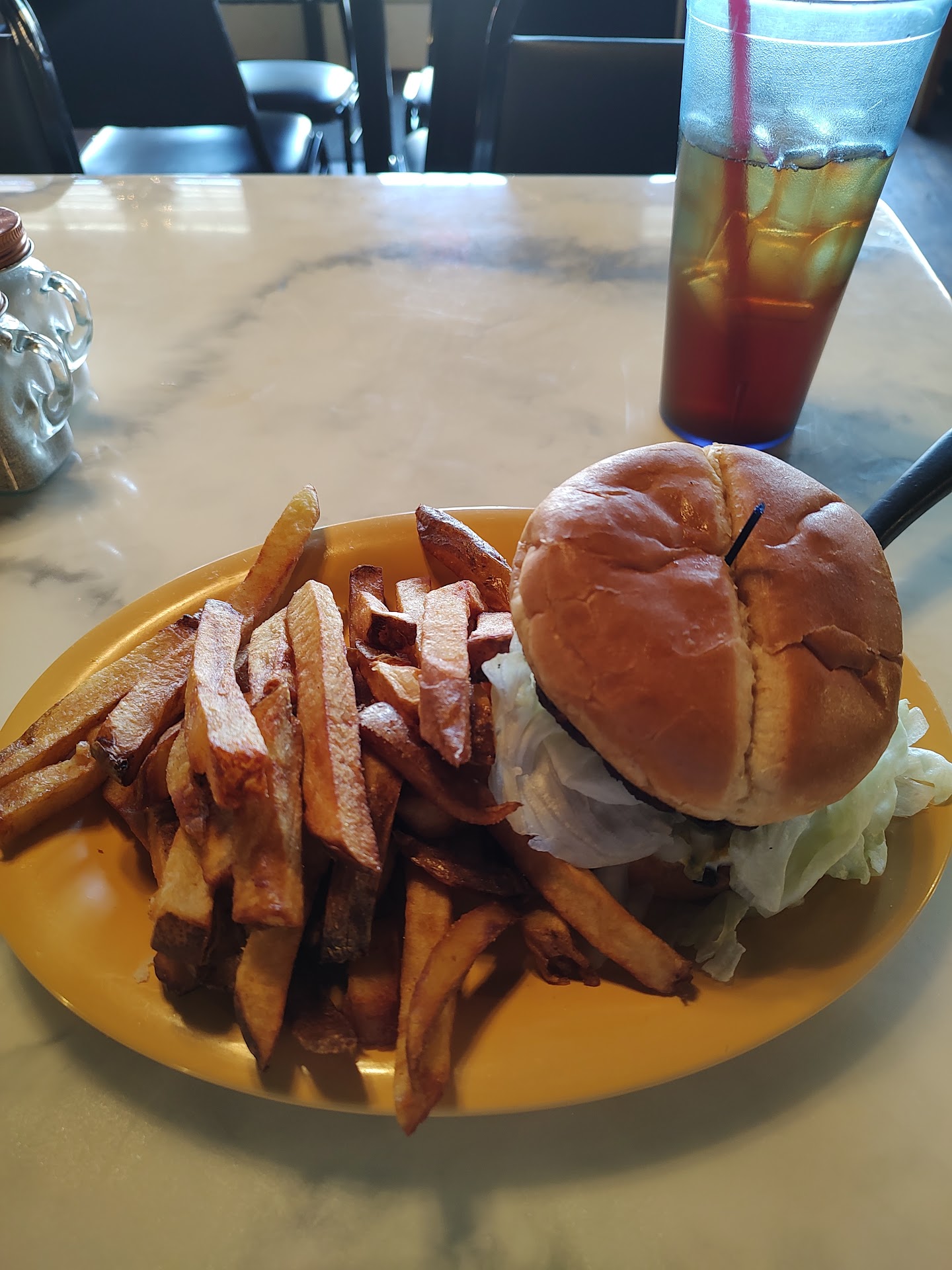Second time there. First visit was the lunch special (Meatloaf) it came with a salad, green beans, with mashed potatoes and gravy and a roll. It was delicious. No pictures though, because I ate it up! I went back for lunch at a later time and got the hamburger with hand cut fries. Your fry selection was shoestring or hand cut. It was delicious, and I had a slice of lemon meringue pie for dessert. Will definitely be back! Ok, I went back for the taco salad and it did not disappoint! My new favorite...