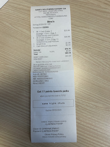 Read moreI visited Sam’s Southern Eatery for the first time today and ordered two crab bags. Unfortunately, they were out of crawfish which we were informed of, but we were not told they were also out of crab until after we had paid $83.59 by card. Once we were seated, the manager came out and informed us that not only were they out of crab, but they also could not process a refund because they had no cash on hand and her manager code had been revoked, preventing her from issuing a card refund. She stated the only option was to receive a gift card instead.
