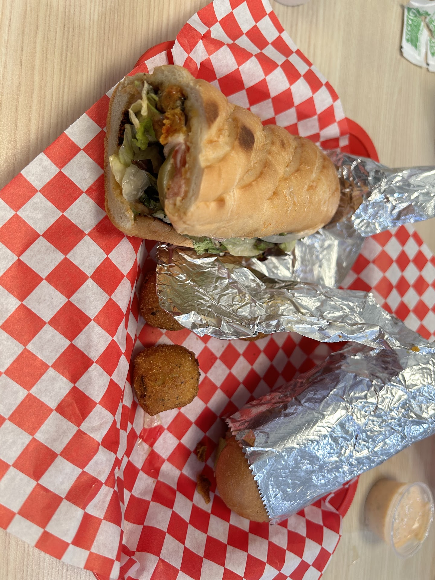 My mom and I went there yesterday, we are both born and raised in South Louisiana, so this Cajun food is the food we know. First thing that caught my eye was the “Sam’s sauce” so I had to try it on a crawfish poboy and some hush puppies. I’m pretty sure it’s roumalade sauce, and it was zesty and spicy and had a nice kick, so it’s a must to try! I hadn’t had hush puppies that small before, but they were very good, and the crisp on the outside was perfect. My crawfish poboy was really pretty good, not the best I’ve ever had, but I’m comparing it to a New Orleans one and I don’t think that I could even do one better than the New Orleans chefs do, but still very tasty! My mother had the fried oyster poboy and green beans. The oysters were very yummy and big! Very small issue with over-breading them and over frying, it’s small but makes a big difference, so my suggestion would be to coat them a little lighter with your breading and then fry till golden. Last but not least…. I had the sweet tea and my mom had the unsweetened tea w/stevia and they were both absolutely perfectly delicious . We will be back to try the fried green tomatoes, the crawfish boil, and I’m hoping much more.