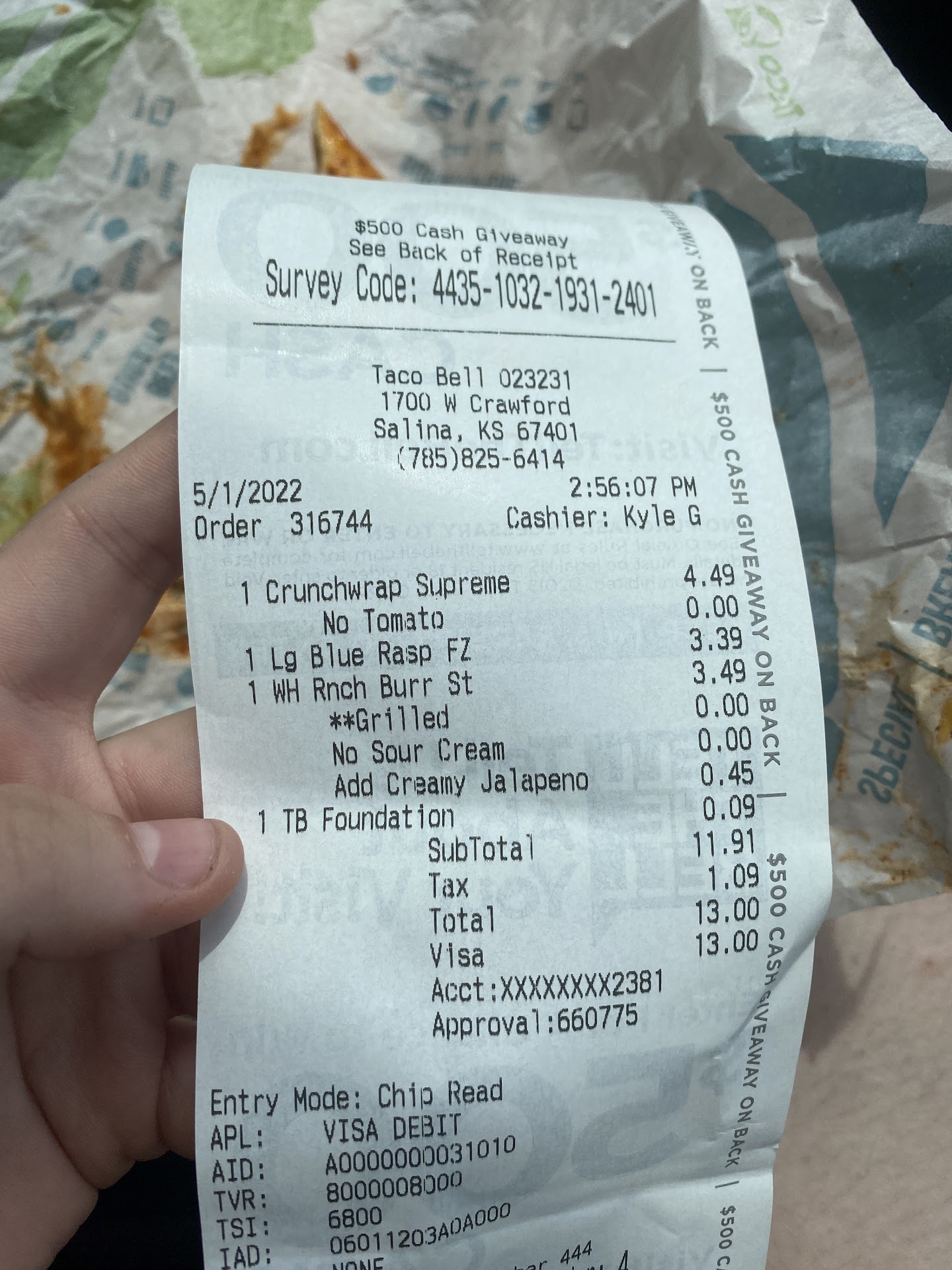 Read moreI'm the biggest taco bell fan in the world. Have also worked in food service when I was young, so I have much respect. I would never leave a bad review unless it was constant bad service. This place is out of everything you want every time you go. Someone needs to start ordering more food, but I think half the time they just don't want to make it bc you special order.Then the worst part is you go home to unwrap your double back up choice, and what you find is either a burrito that looks like it was made yesterday or a soggy mess with more ingredients outside the shell than in. I tell myself every time. Give them one more chance, but I am constantly disappointed. Just for reference check out the other reviews I have left here in salina. Most of them are 5 stars compliments, giving props to a food service team that messed up but did everything they could to make it right, or complimenting a team that was low staffed but still doing their best. I will be avoiding this taco bell, and driving across town until I hear from management or someone telling me they have taken care...