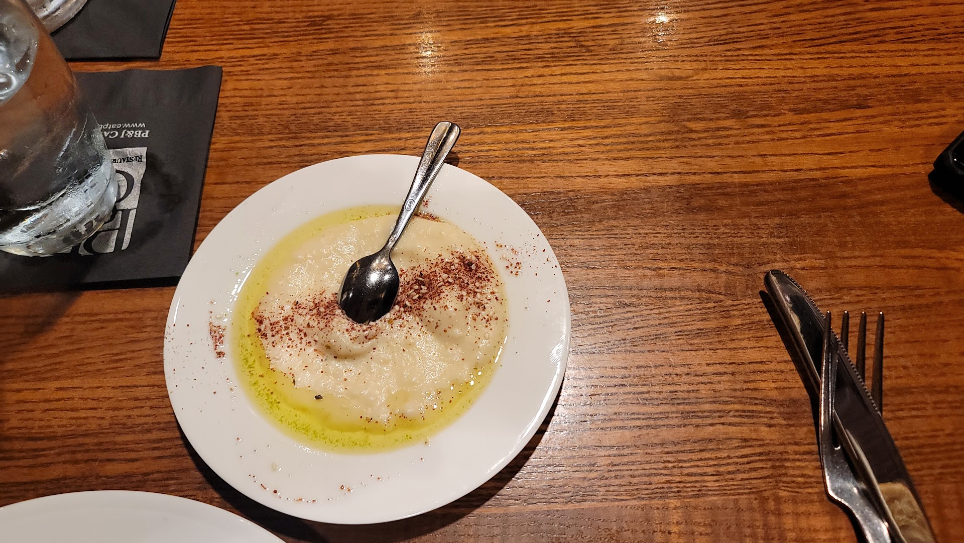 Our food experience here was probably a 5 star average. The appetizers were all very good. We had crab cakes, and some kind of chicken flatbread pizza-type dish. Both were very good, but our favorite was the complementary bread with baba ganoush!